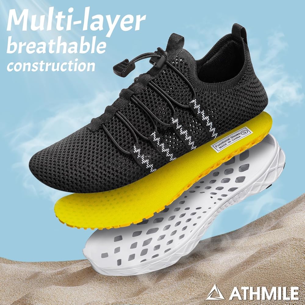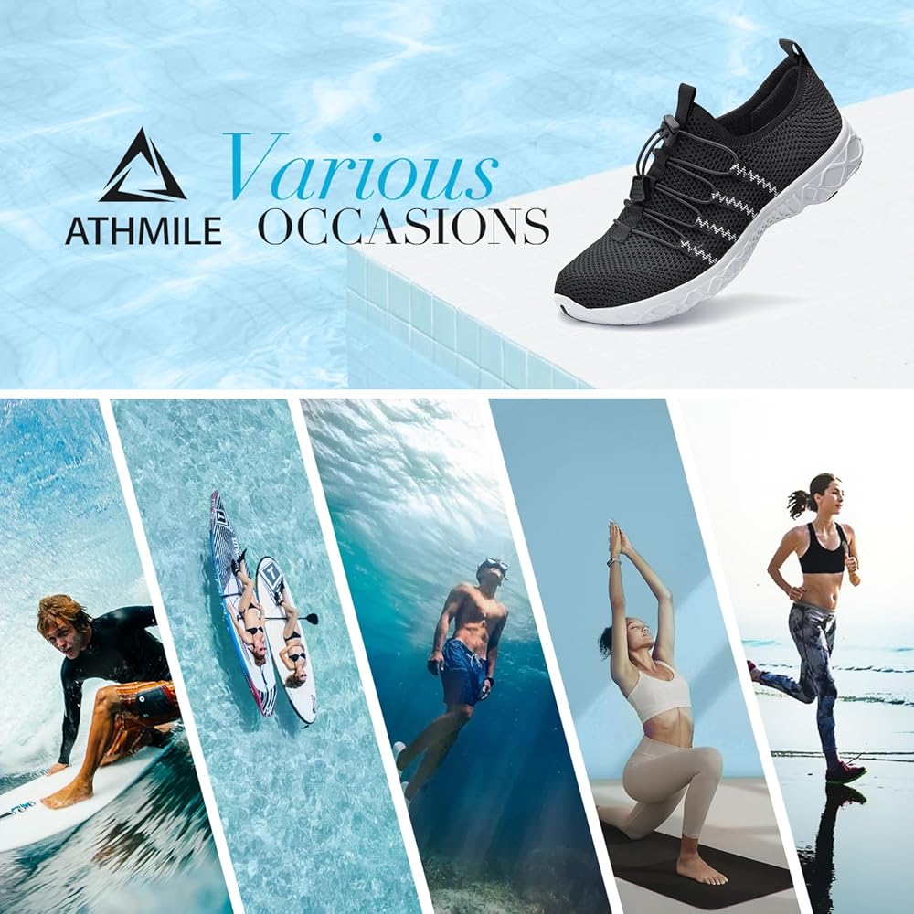 مقاوم للانزلاق - تعتمد أحذية السباحة الرجالية أحدث تقنيات ATHMILE المضادة للانزلاق. يوفر النعل المطاطي ذو النمط الفريد متعدد الدوائر قبضة ممتازة من جميع النواحي، بدلاً من القبضة العادية أحادية الاتجاه. يمكنها مقاومة الانزلاق في جميع الاتجاهات، لذلك يمكنك الحفاظ على التوازن بسهولة أثناء ممارسة الرياضة في الهواء الطلق.
