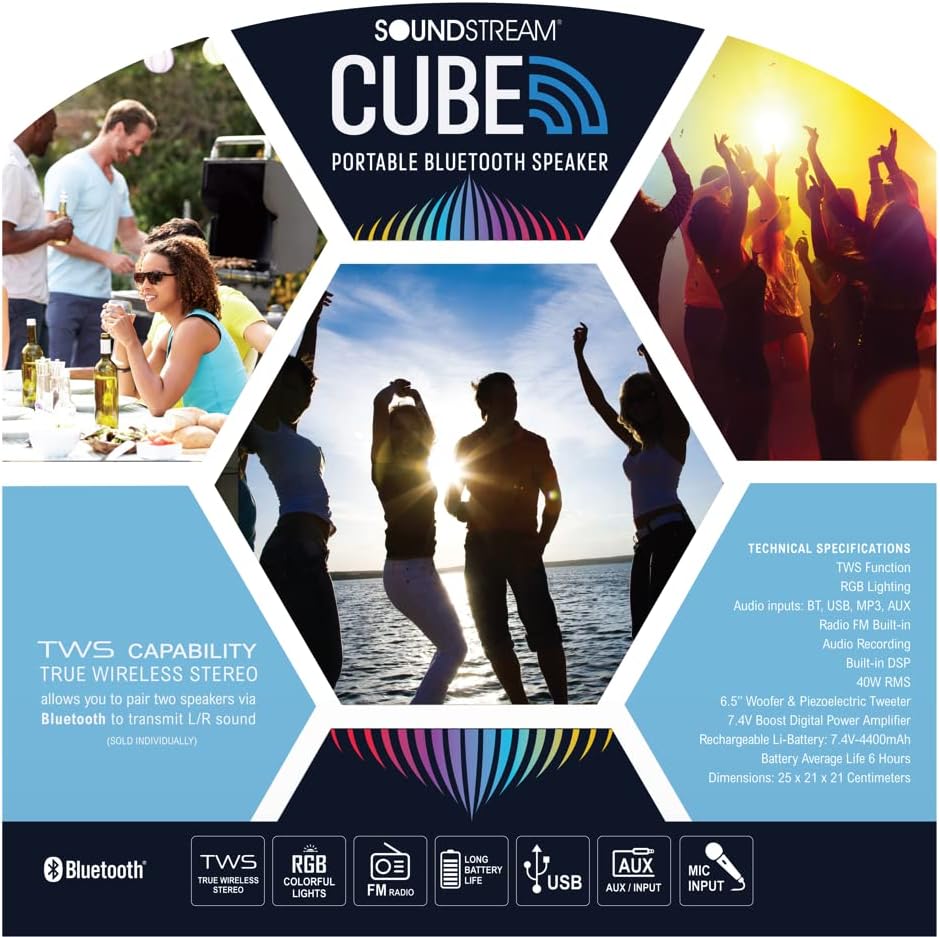 مكبر صوت بلوتوث محمول للحفلات SOUNDSTREAM مع صوت جهير عميق عالٍ، زوج 2 مع مكبر صوت ستيريو لاسلكي حقيقي (TWS)، قابل لإعادة الشحن والتحكم في النغمات، مزامنة عرض أضواء RGB ووقت تشغيل 6 ساعات عند ذروة 80 واط