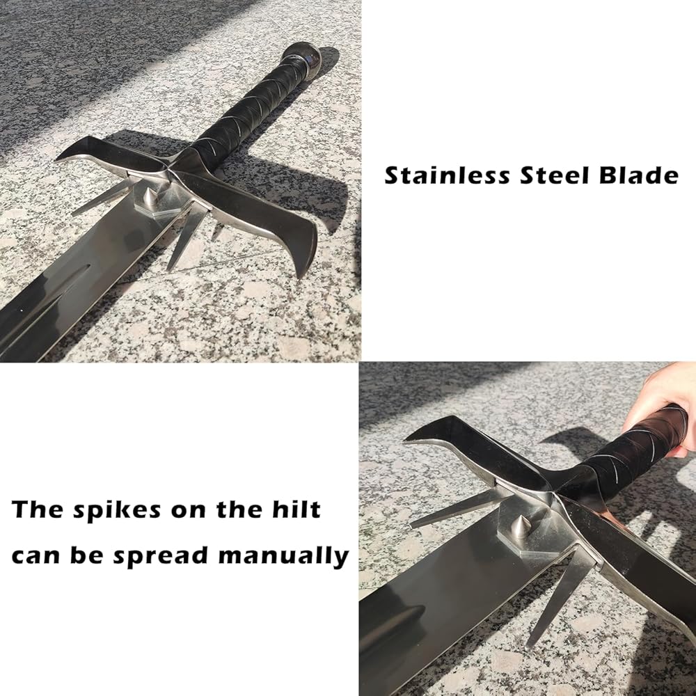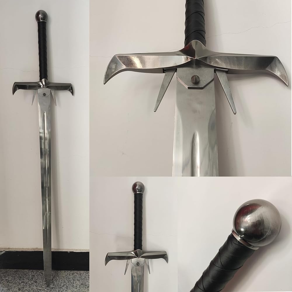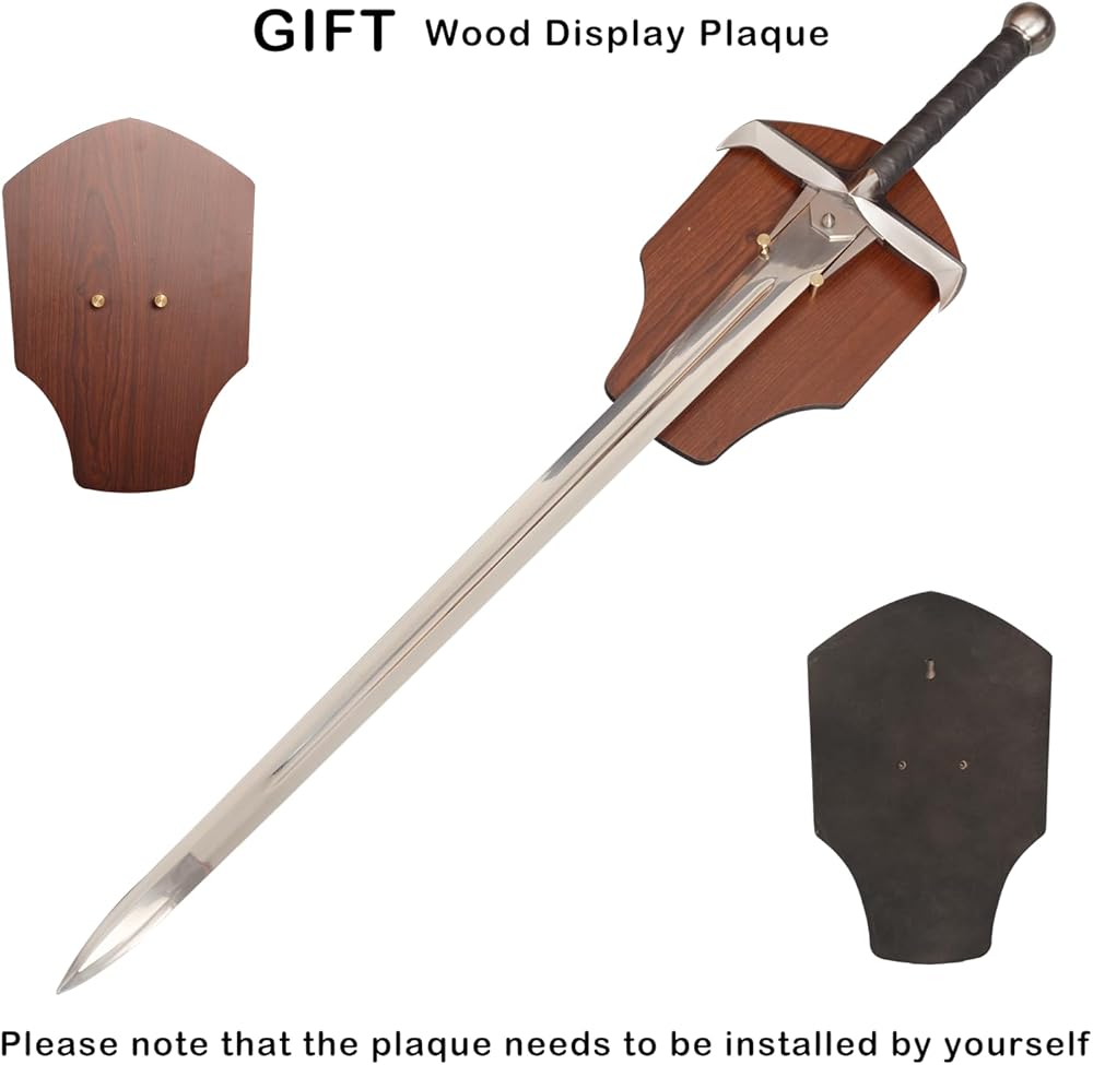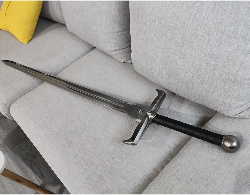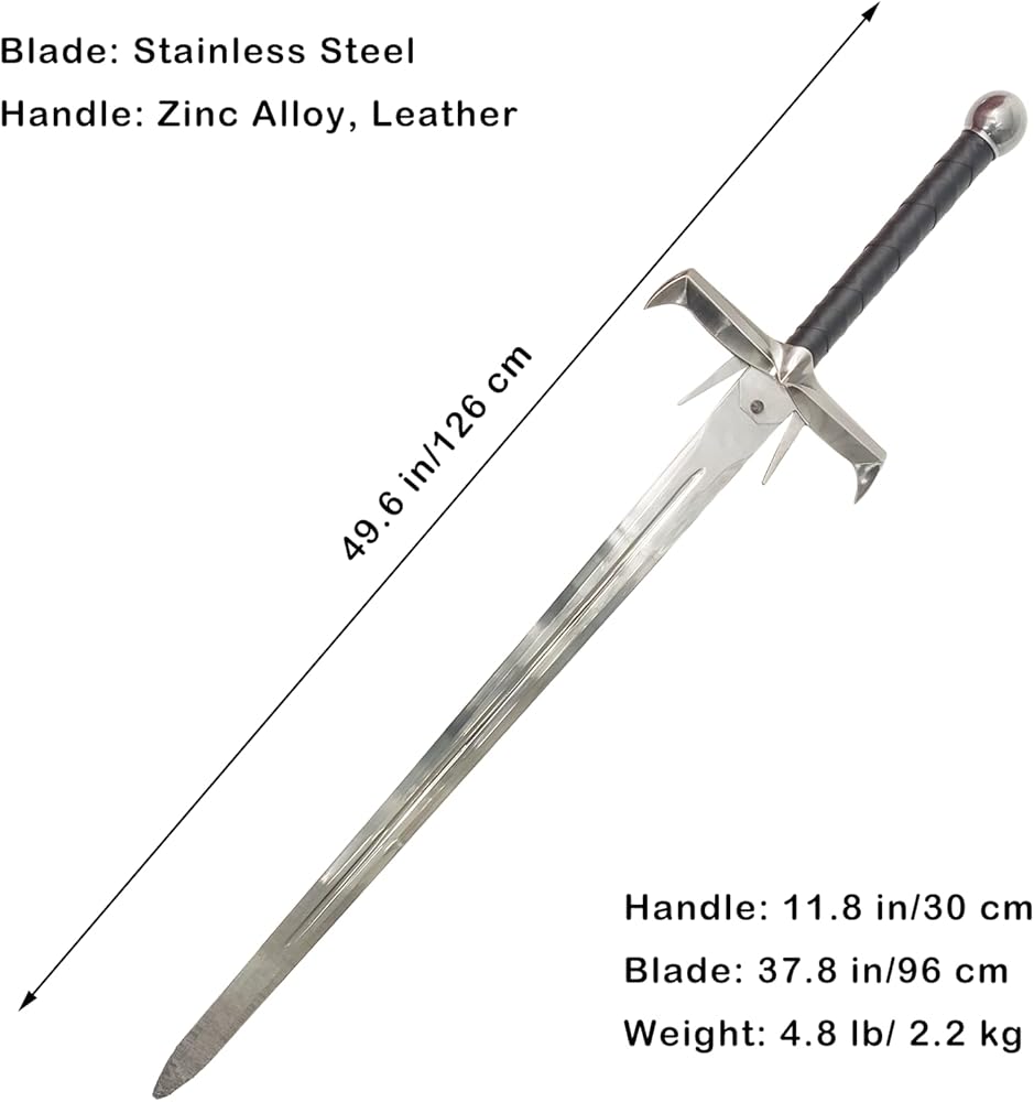 【Specification】Total Length with Scabbard:49.6 in; Handle: 11.8 in; Blade: 37.8 in; Total Width: 10.6 in; Blade Width: 2.2 in; Total Weight: 4.8 lb / 2.2 kg 【Material】Blade: stainless steel; Handle: zinc alloy, leather. Please note that the blade is NOT sharp. 【Application】Perfect for cosplay, gifts, collection 【Design】Knife tip guard, leather-wrapped handle, stainless steel blade. 【After-Sales】If you have any questions about the sword you received, please feel free to contact us. We will get back to you within 24 hours