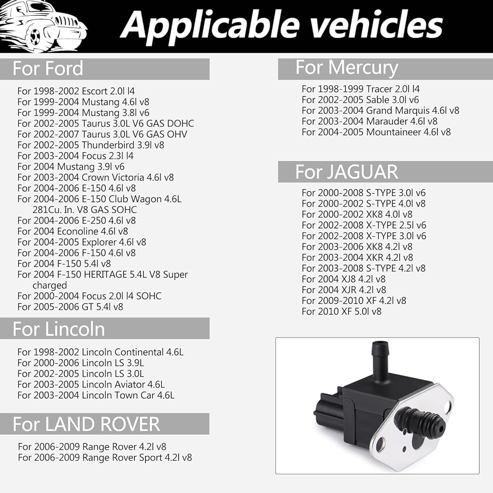 • 1. مستشعر ضغط الوقود FPS7 هذا مناسب لـ 2004-2006 Ford F150 4.6L، 2004-2005 Ford Explorer 4.6L، 2005-2006 Ford E-150 4.6L، 2002-2007 Ford Taurus 3.0L، 2005-2006 Ford E- 250 4.6L، 2000-2004 Ford Focus 2.0L، 2003-2004 Lincoln Town Car 4.6L، 2000-2006 Lincoln LS 3.9L، 1998-1999 Mercury Tracer 2.0L، إلخ. يرجى الاطلاع على الوصف أدناه للحصول على رقم طراز السيارة الكامل.