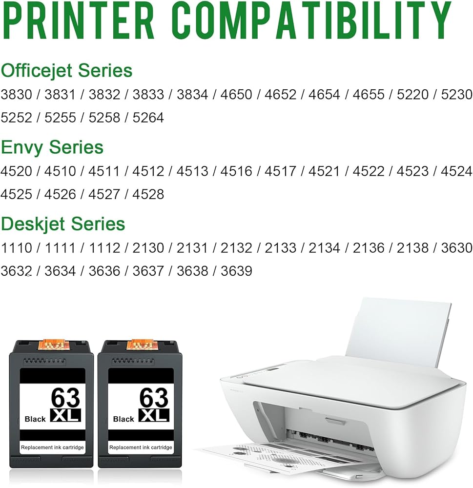 • خرطوشة حبر سوداء 63XL متوافقة مع: HP Envy 4520، 4521، 4522، 4523، 4524، 4525، 4526، 4527، 4528، 4510، 4511، 4512، 4513، 4516، 4517