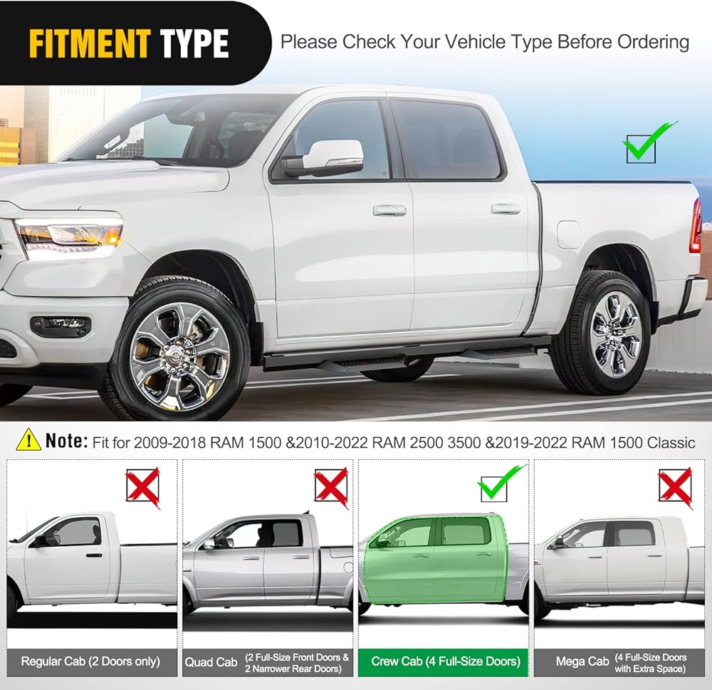 التوافق: يناسب 2009-2018 دودج رام 1500 طاقم الكابينة و2010-2024 رام 2500 3500 طاقم الكابينة و2019-2024 رام 1500 طاقم الكابينة الكلاسيكية (باستثناء 1500 نماذج ديزل كابينة الهيكل). إذا لم تكن متأكدًا من الطراز الذي لديك، فيرجى التحقق من صورة مقاس الكابينة
