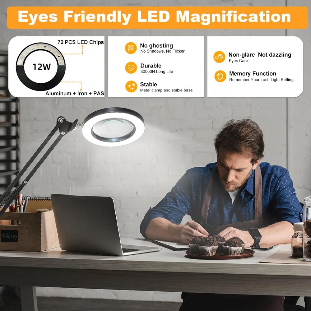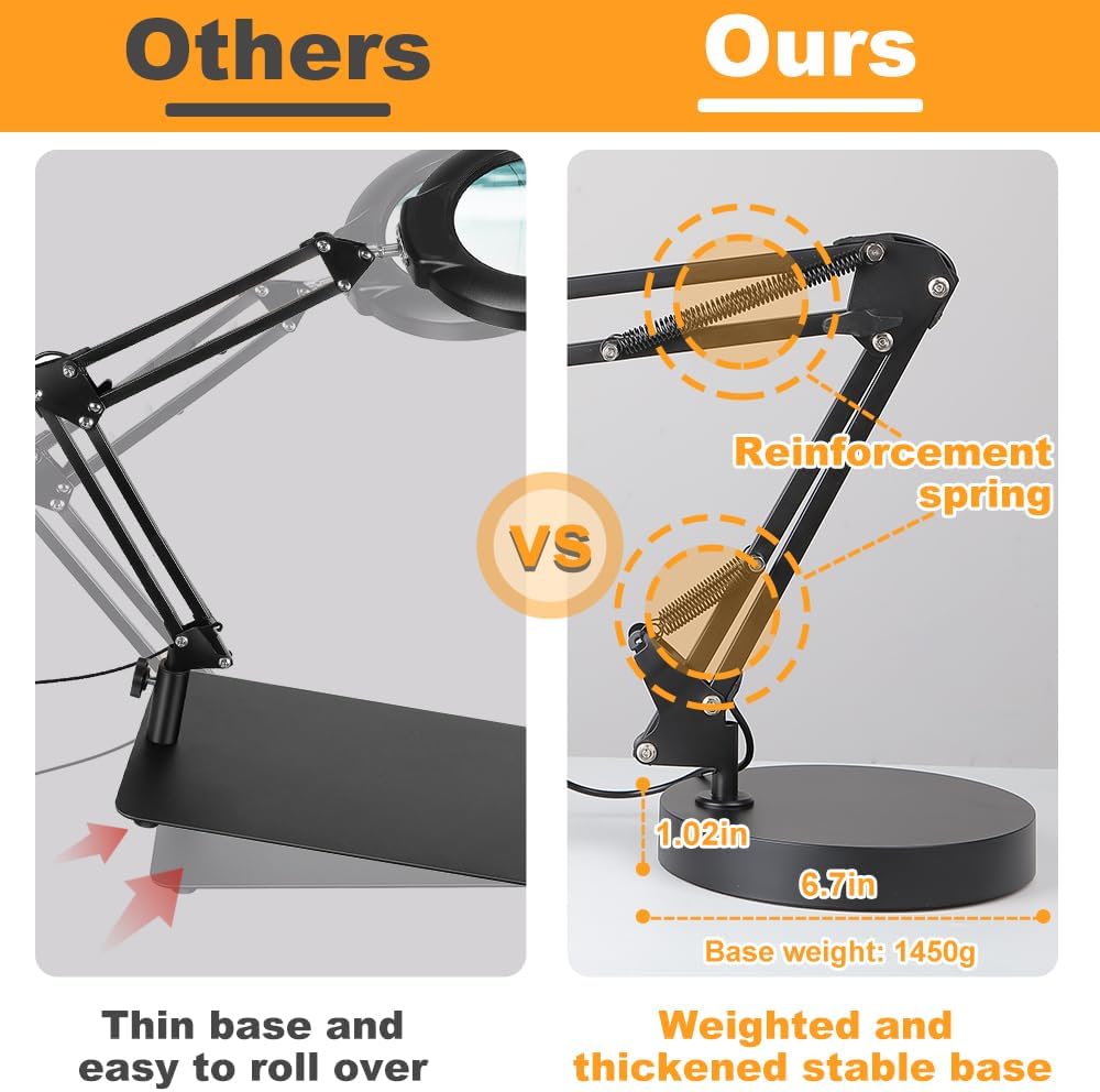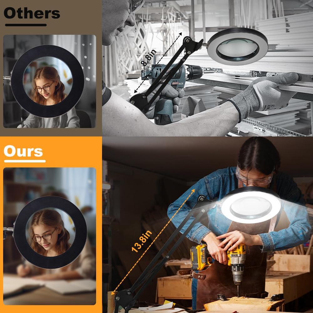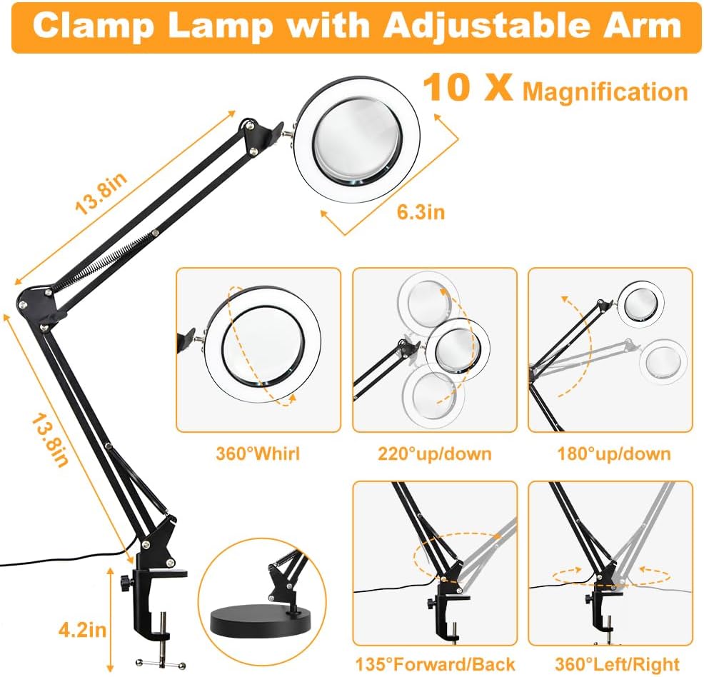【تعديل مرن وأذرع متأرجحة طويلة】: يحتوي المصباح الزجاجي المكبر على ذراعين دوارين معدنيين متصلين و4 زنبركات قوية. يمكن تمديد الذراع الطويلة حتى 20 بوصة. يمكن تدوير رأس المصباح 360 درجة. إنها مناسبة للعمل عن بعد الثابت والاستخدام اليومي.