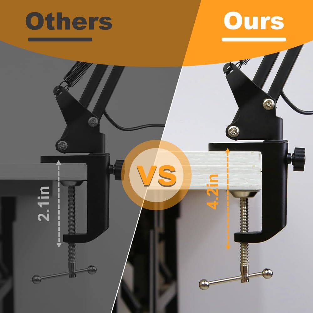 【مصباح طاولة 2 في 1 قابل للتعديل ومصباح مشبك】: مصباح المرآة الكبير مجهز بقاعدة مرجحة ومشبك على شكل حرف C. يصل وزن القاعدة إلى 3.3 رطل، وهو ليس من السهل طيه عند إمالة الذراع، كما أنه مناسب لتحريك موضع جسم المصباح؛ مشبك الطاولة مستقر وأكثر متانة ويمكنه تثبيت سطح المكتب بسمك 4.2 بوصة.