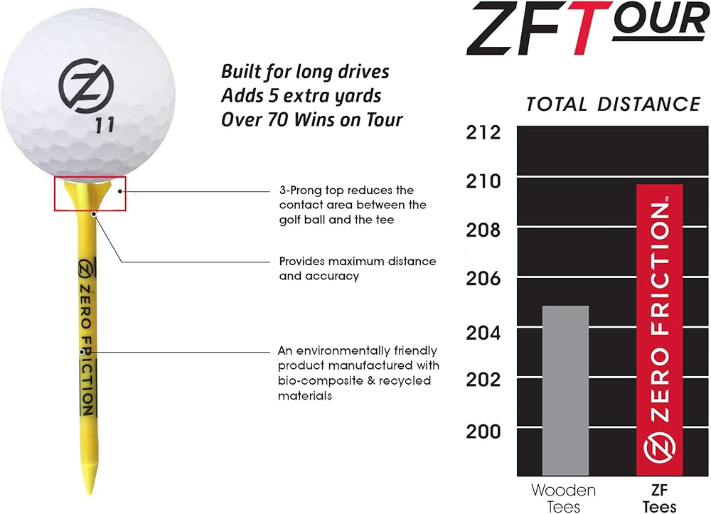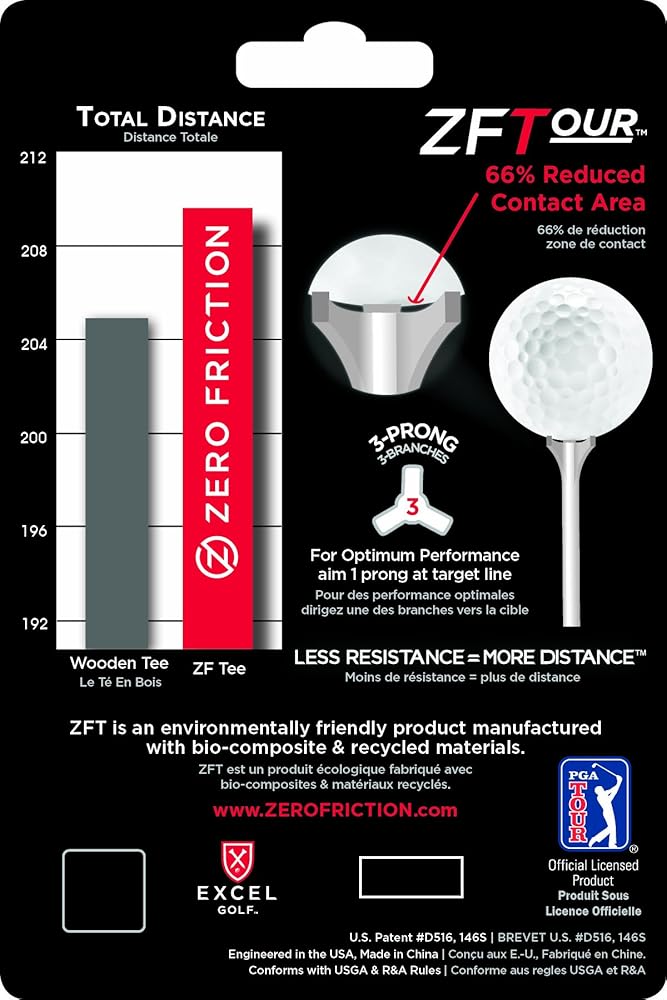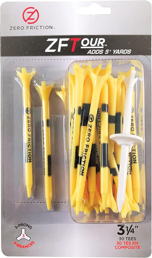 The ZFT System Golf Tees combine the performance technology of the Original 3-prong Zero Friction Golf Tee with an innovative striping system that allows for individuals to place their golf tee at the same height every time, optimizing performance. The ZFT System Composite Golf Tee is manufactured using bio-composite materials, and so is friendly to the environment.
