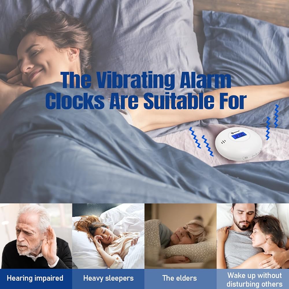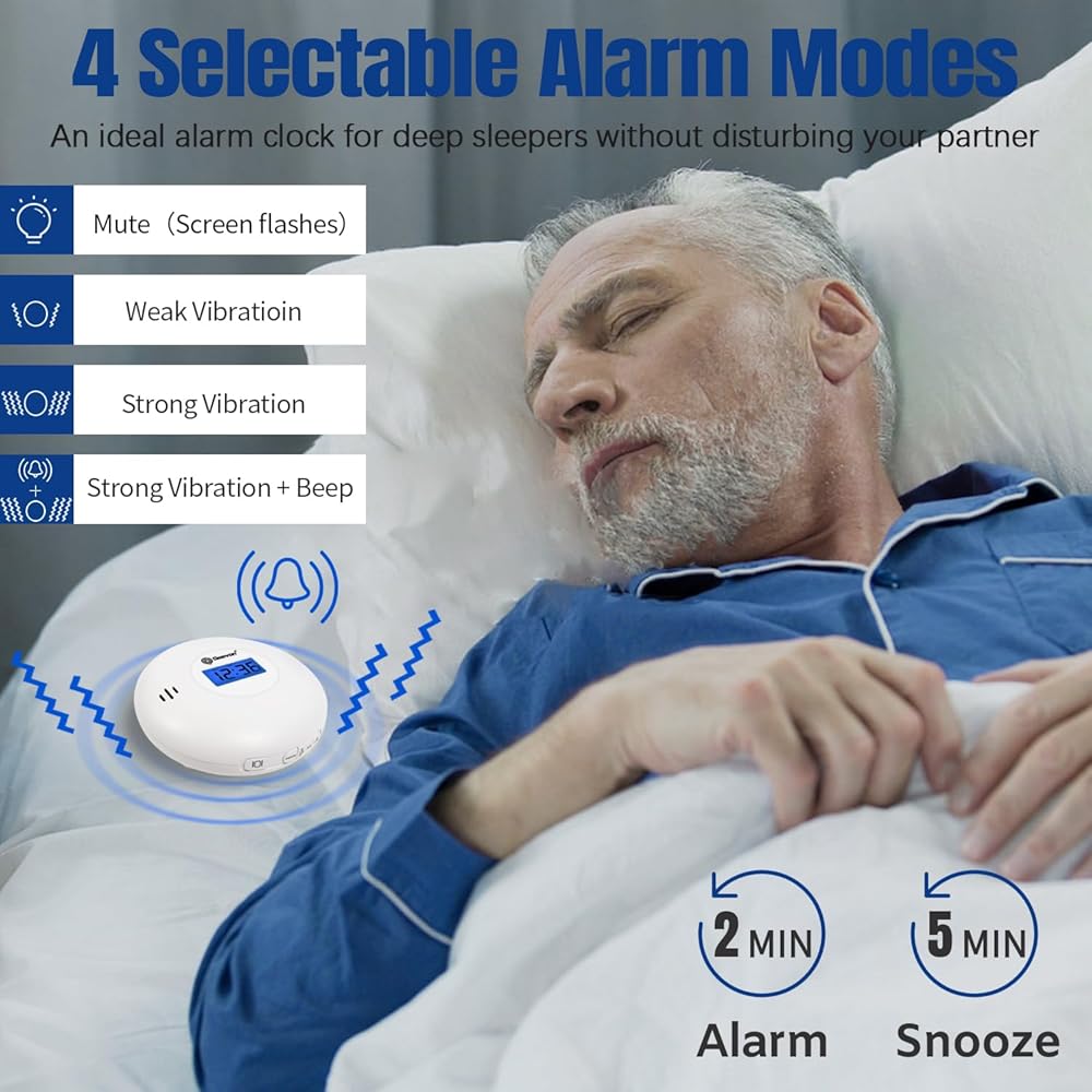 【4 أوضاع منبه للنوم الثقيل】بالمقارنة مع منبه الصوت العادي، تأتي ساعة المنبه الاهتزازية لدينا مع 4 أوضاع منبه محدثة: 1. ومضات الشاشة 2. اهتزاز ضعيف 3. اهتزاز قوي 4. اهتزاز قوي + ضوضاء صفير. ما عليك سوى الضغط على زر "VIB" لتعيين طريقة الاستيقاظ المفضلة لديك لتلبية الاحتياجات المختلفة. إنها بالتأكيد ساعة منبه عالية ممتازة للأشخاص الذين ينامون كثيرًا، والنوم العميق، والبالغين، والصم، وذوي الإعاقة السمعية، لأي شخص.