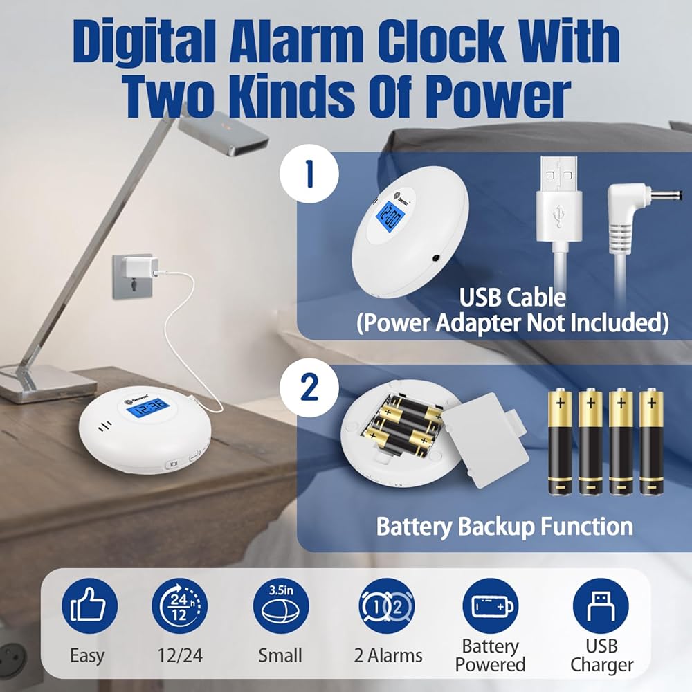 【يعمل بالبطارية وسلك USB】على عكس ساعة المنبه الأخرى التي تعمل بالبطارية والتي تحتاج دائمًا إلى تغيير البطارية، فإن ساعة منبه السفر من جيفون مع هزاز السرير مجهزة بسلك طاقة USB، والذي يمكنك توصيله بجهاز كمبيوتر أو مقبس للاستخدام. إذا كنت تريد حملها معك، يمكنك استخدامها في أي وقت وفي أي مكان بعد تثبيت البطارية. (يوصى باستخدام البطارية كمصدر طاقة احتياطي.) يمكن الاعتماد عليها للاستخدام اليومي والسفر والتنقل ورحلة العمل.