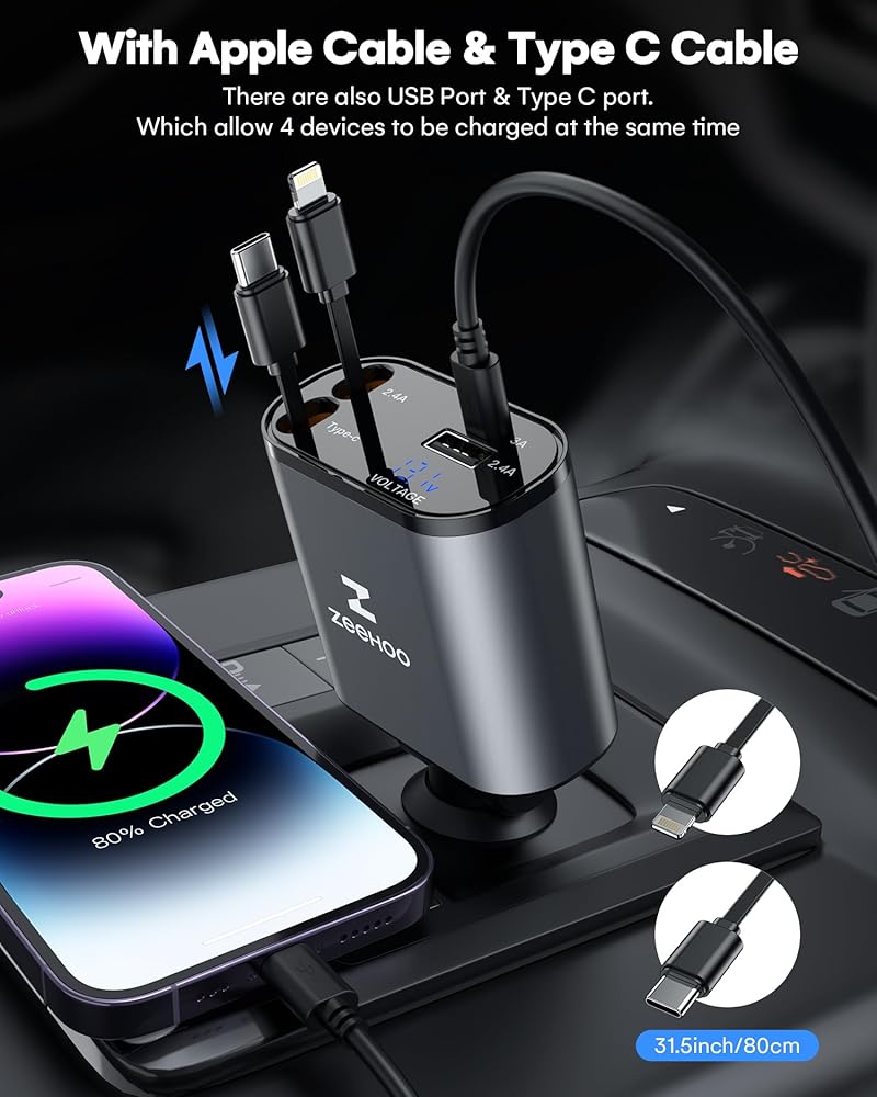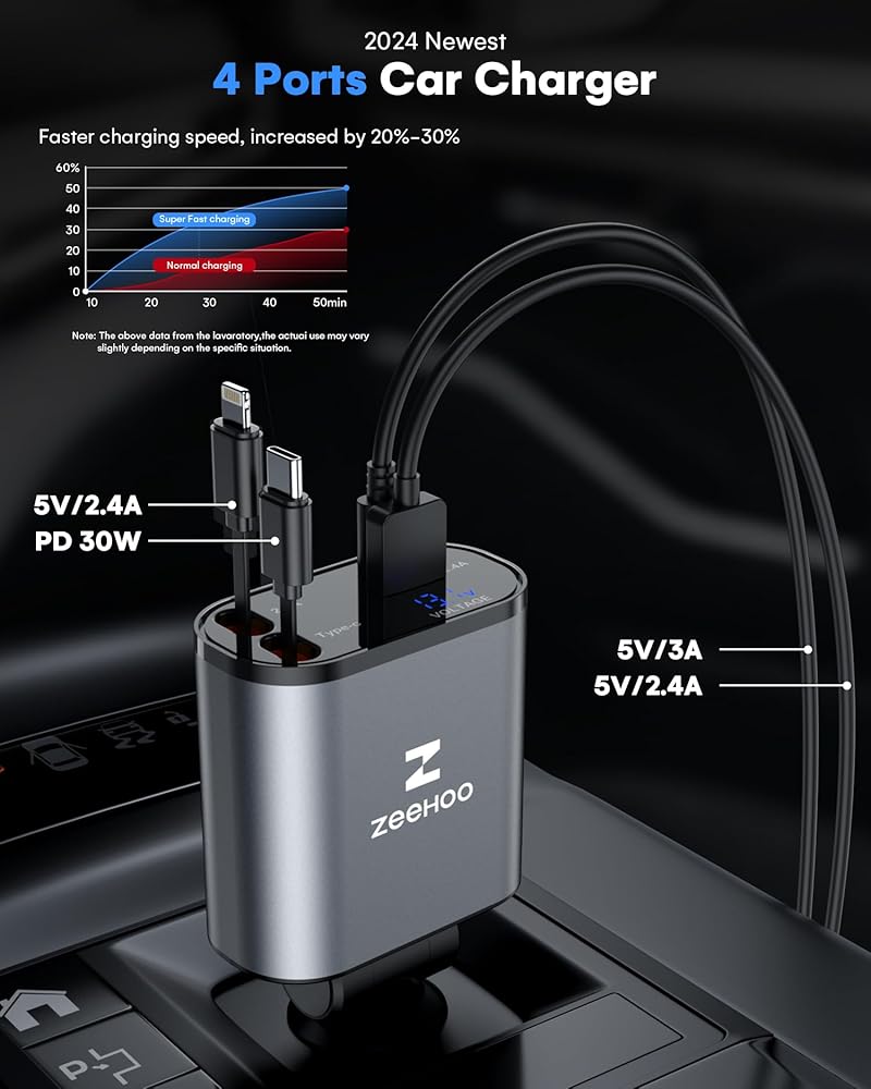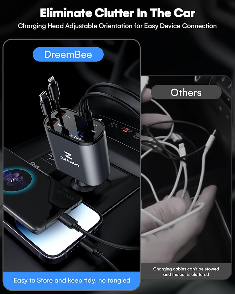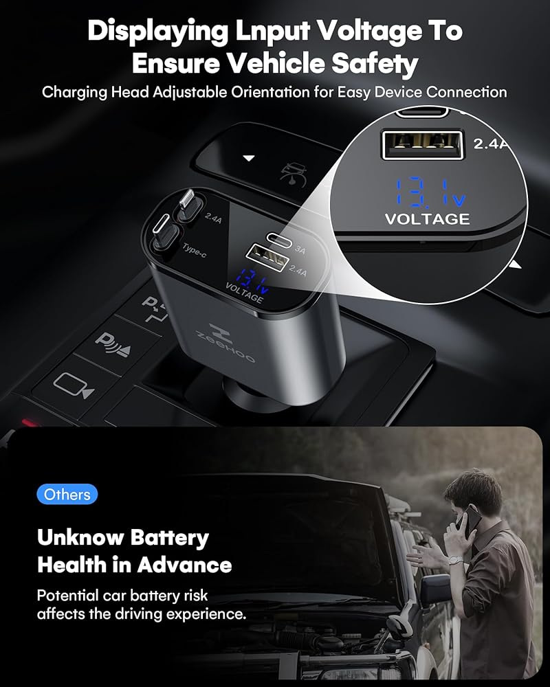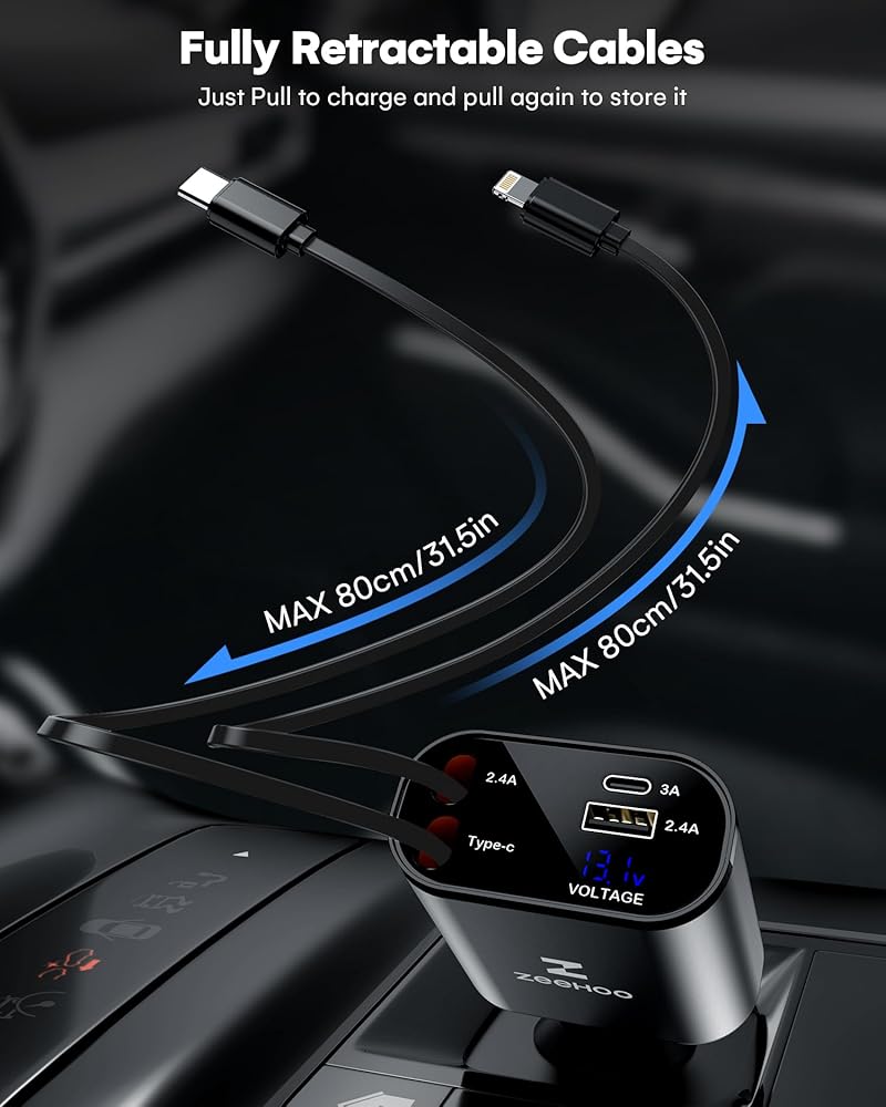 مريحة وموثوقة: بفضل الحبال القابلة للسحب، لم يعد هناك ما يدعو للقلق بشأن تشابك الكابلات أو الأجزاء الداخلية الفوضوية للسيارة. يوفر شاحن السيارة ZEEHOO تجربة شحن موثوقة وسريعة ومريحة، مما يجعله ملحقًا ضروريًا لكل مالك سيارة.