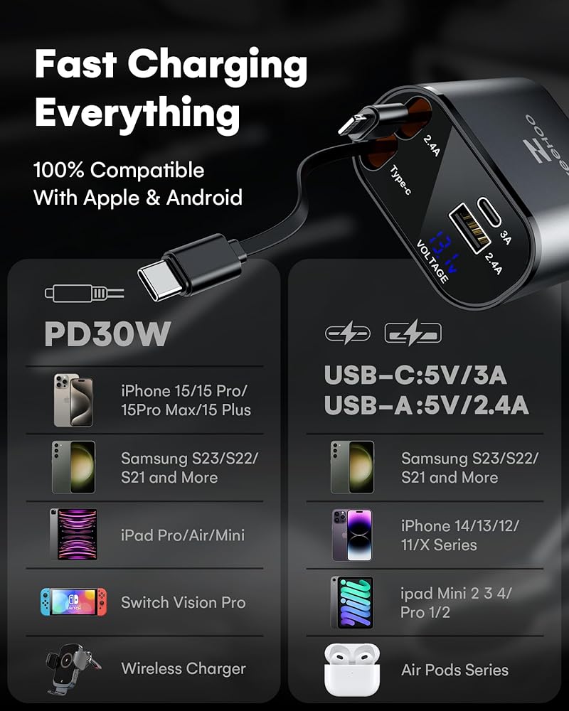تصميم قابل للسحب 4 في 1: تم تصميم شاحن السيارة المبتكر هذا لتوفير مساحة صغيرة وسيارة مرتبة. بفضل ميزته القابلة للسحب، فإنه يقوم بتمديد أو سحب الكابلات بسهولة للحصول على تجربة شحن منظمة وخالية من الفوضى.
