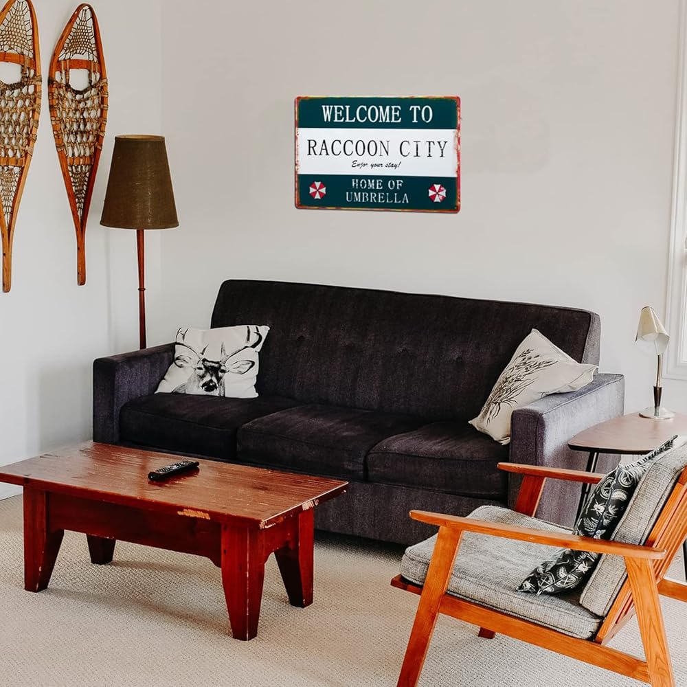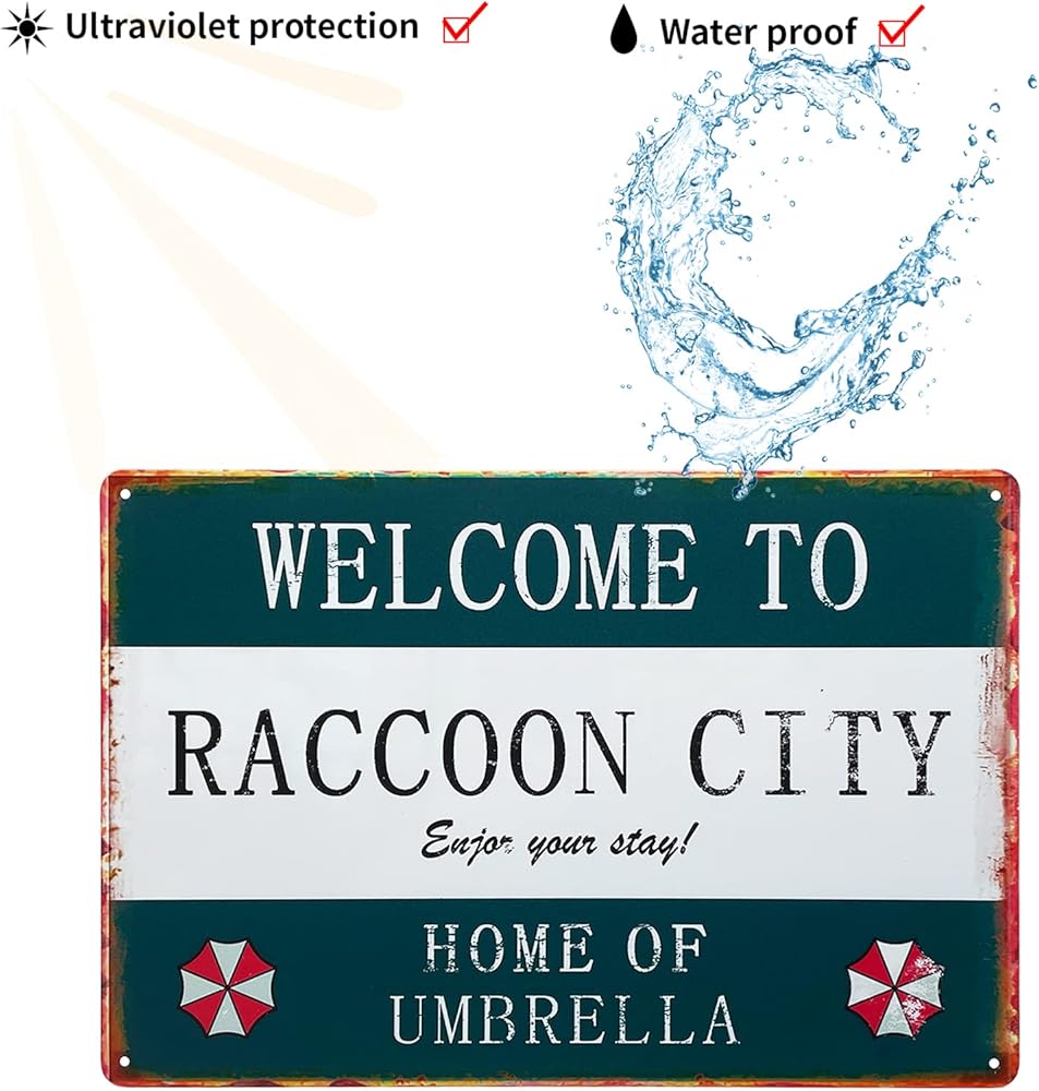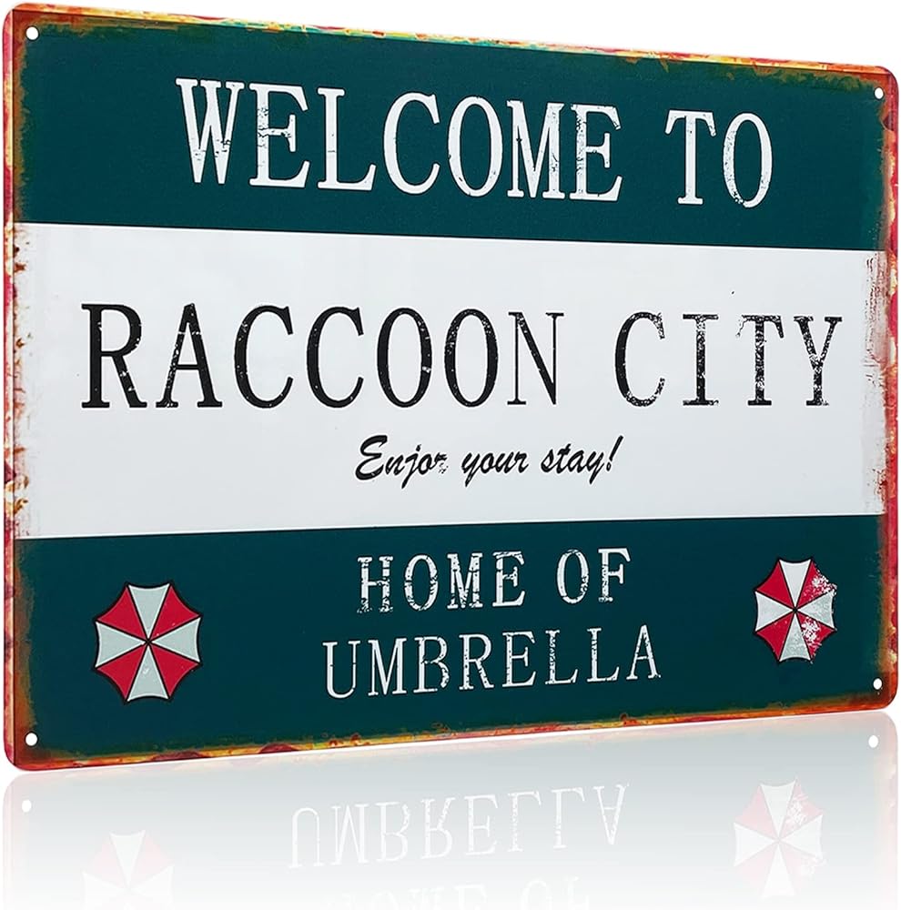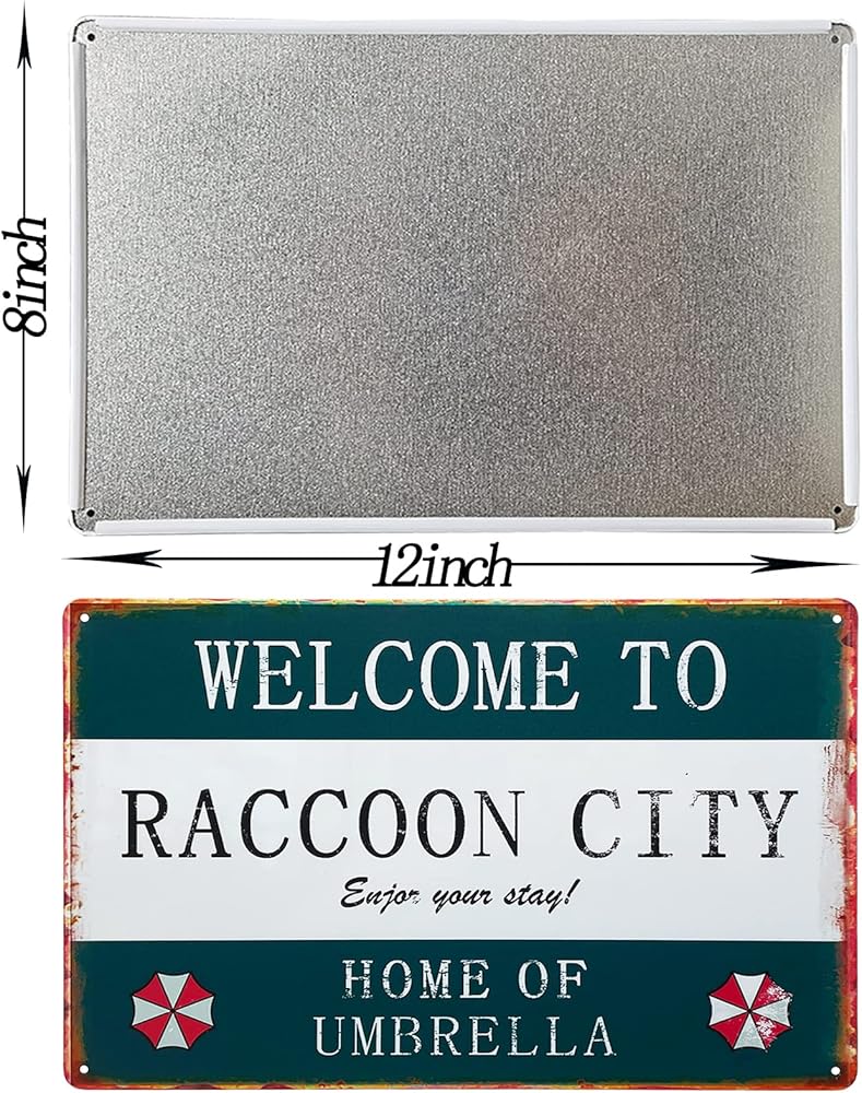 لافتة معدنية من القصدير شخصية ريترو مقيم مرحبًا بكم في مدينة الراكون، لافتة مظلة للمنزل، لافتة حديد من المواد المنزلية، علامة تزيين معدنية أنيقة، 12 * 8 بوصة