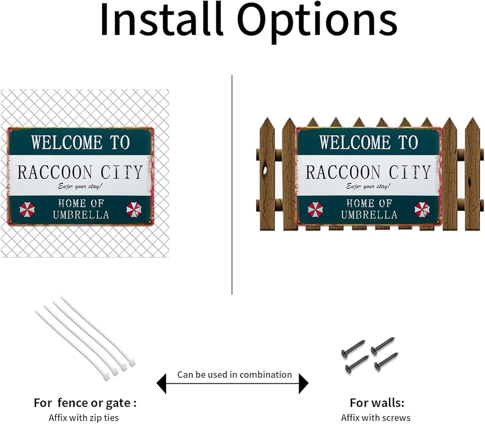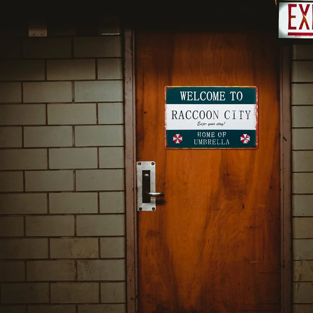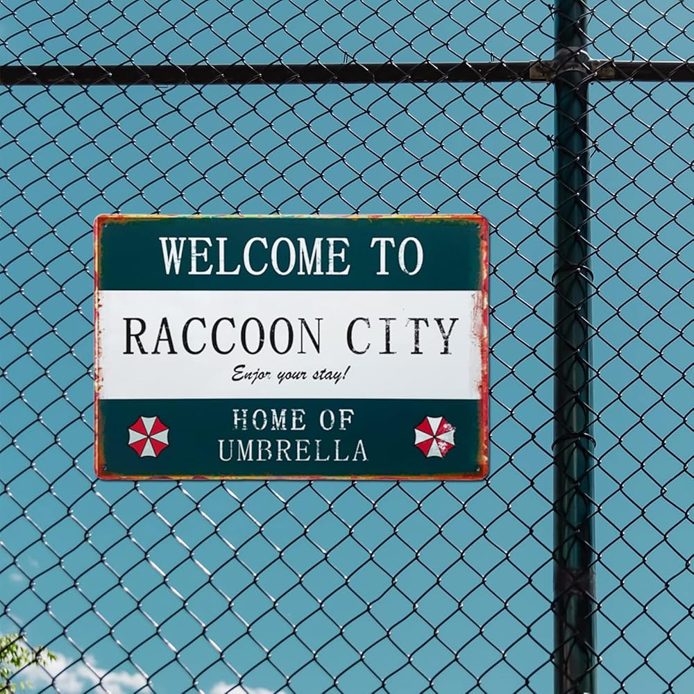 لافتة معدنية من القصدير شخصية ريترو مقيم مرحبًا بكم في مدينة الراكون، لافتة مظلة للمنزل، لافتة حديد من المواد المنزلية، علامة تزيين معدنية أنيقة، 12 * 8 بوصة