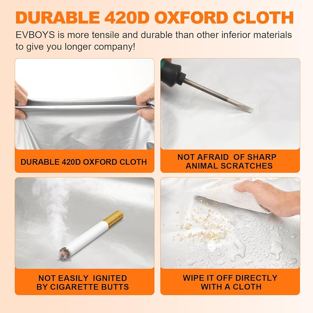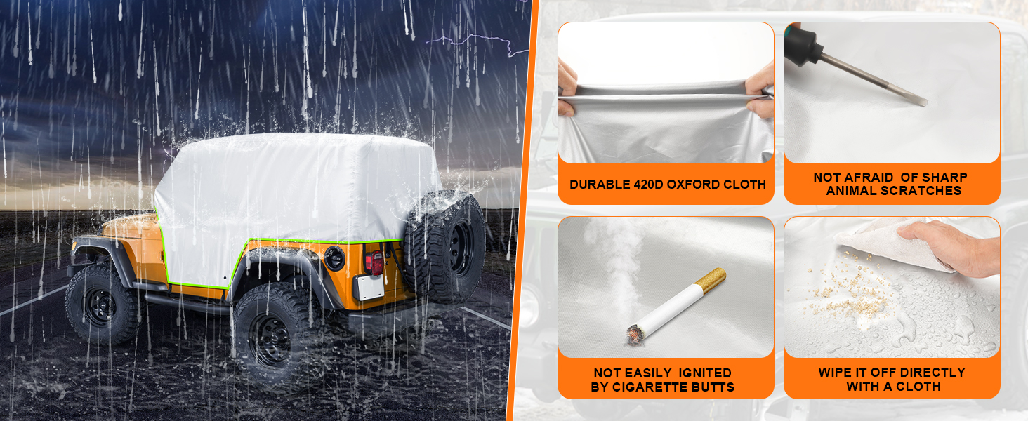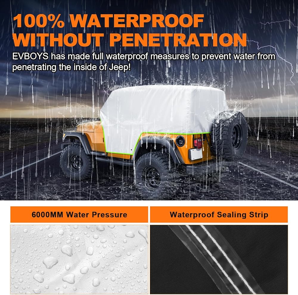 【مادة عالية الجودة】غطاء EVBOYS Wrangler TJ مصنوع من مادة نسيج أكسفورد 420D المطورة وهي مقاومة للتآكل، ومقاومة للخدش، ومقاومة للتمزق، ومقاومة للأشعة فوق البنفسجية، وتحمي السيارة بشكل فعال من أضرار الأشعة فوق البنفسجية. وهذا يجعلها أكثر شدًا ومتانة من المواد الرديئة الأخرى لتمنحك صحبة أطول. الجزء الداخلي عبارة عن طبقة مقاومة للماء عالية الكثافة بنسبة 100%، وتتحمل ضغط الماء حتى 6000 مم، وتمنع تسرب مياه الأمطار. بالإضافة إلى ذلك، فهي مصنوعة من خيط مقاوم للماء مزدوج الغلق يمنع الاختراق ويحتوي على لوح مقاوم للماء. يوفر الحماية لمركباتك طوال العام.