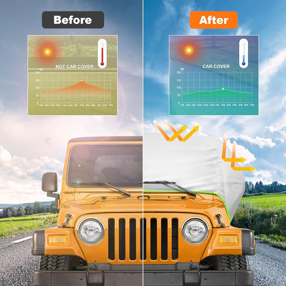 【حماية كاملة】- بغض النظر عن الشمس الحارة أو الطقس البارد أو الرياح، يمكن لغطاء Evboys Wrangler TJ ذو البابين التعامل مع كل شيء. تحافظ المادة القوية على سلامة سيارتك من الأشعة فوق البنفسجية والرمل والغبار والأوراق والفروع والثلج والمطر والصقيع وسقوط الطيور وأعقاب السجائر ويمكنك مسح هذه الأشياء مباشرة بقطعة قماش!