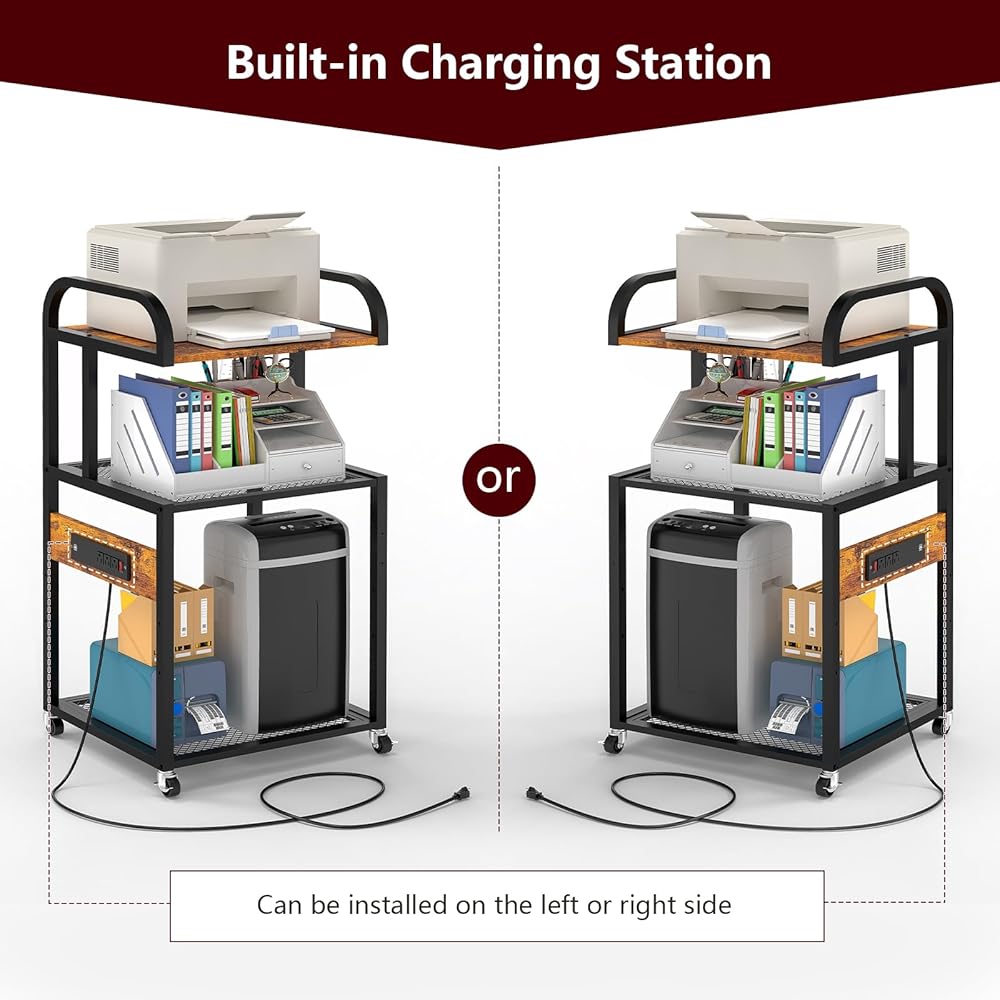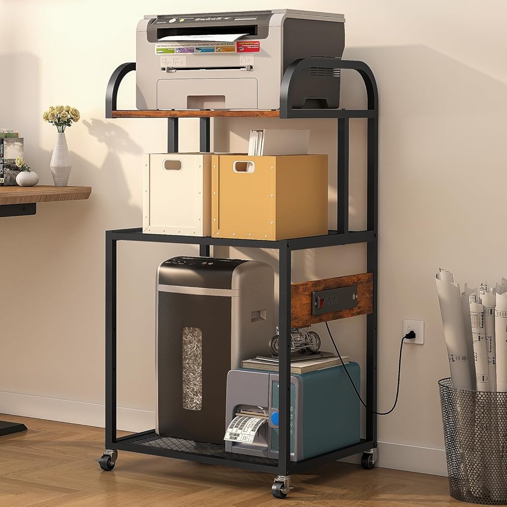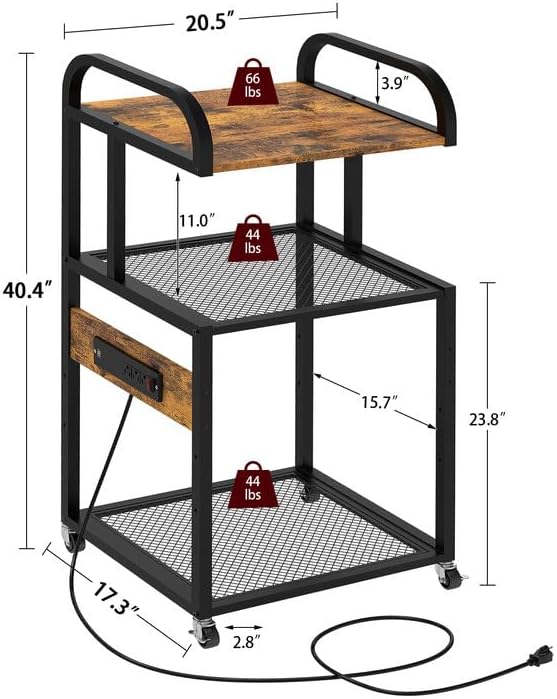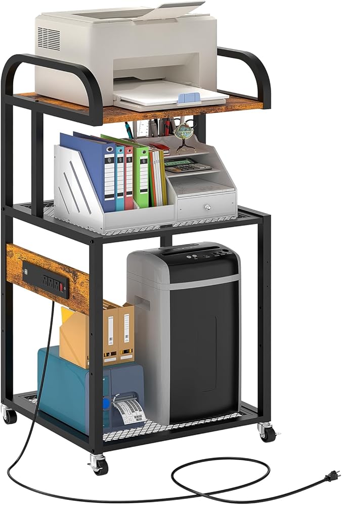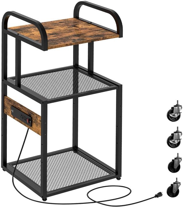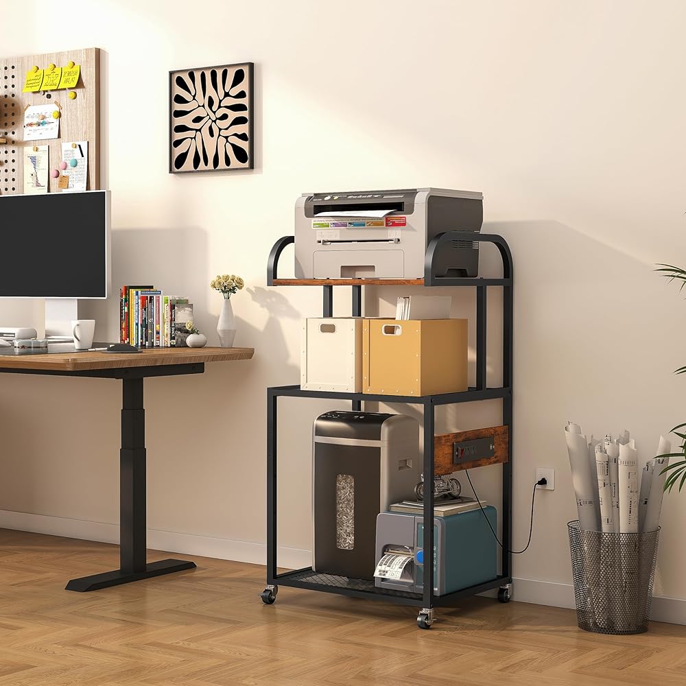 حامل طابعة WEENFON مع رف تخزين قابل للتعديل، طاولة طابعة 3 طبقات بعجلات، عربة دوارة مع منافذ طاقة ومنافذ USB، آلة التقطيع وحامل وحدة المعالجة المركزية للمكتب المنزلي، غرفة المعيشة، بني ريفي