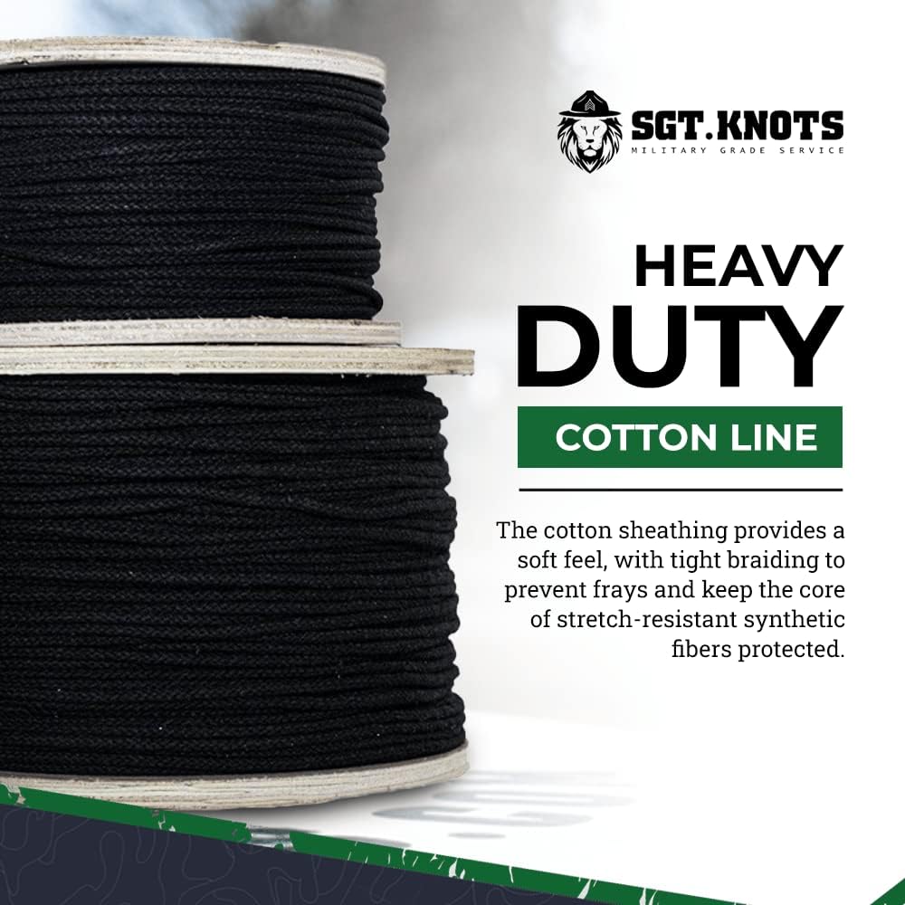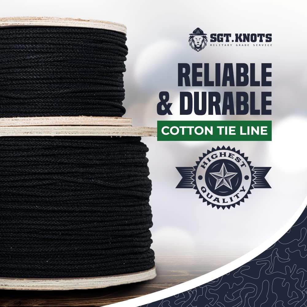 • LENGTH and WIDTH - Choose between pre-cut lengths of 100 feet, 300 feet, 600 feet, or 3000 feet. SGT KNOTS Cotton Tie Line diameter thickness option: 1/8 inch. Available in Black.