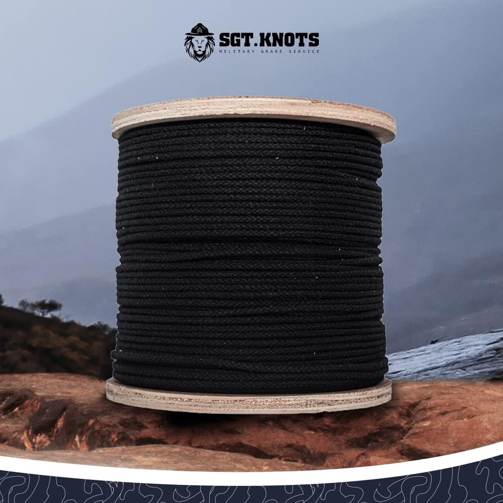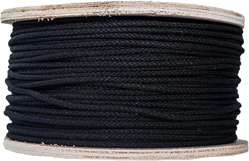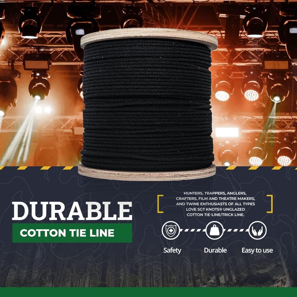 LENGTH and WIDTH - Choose between pre-cut lengths of 100 feet, 300 feet, 600 feet, or 3000 feet. SGT KNOTS Cotton Tie Line diameter thickness option: 1/8 inch. Available in Black.