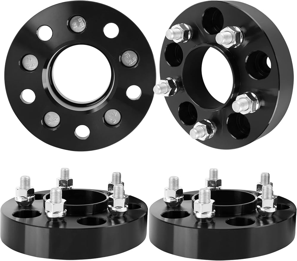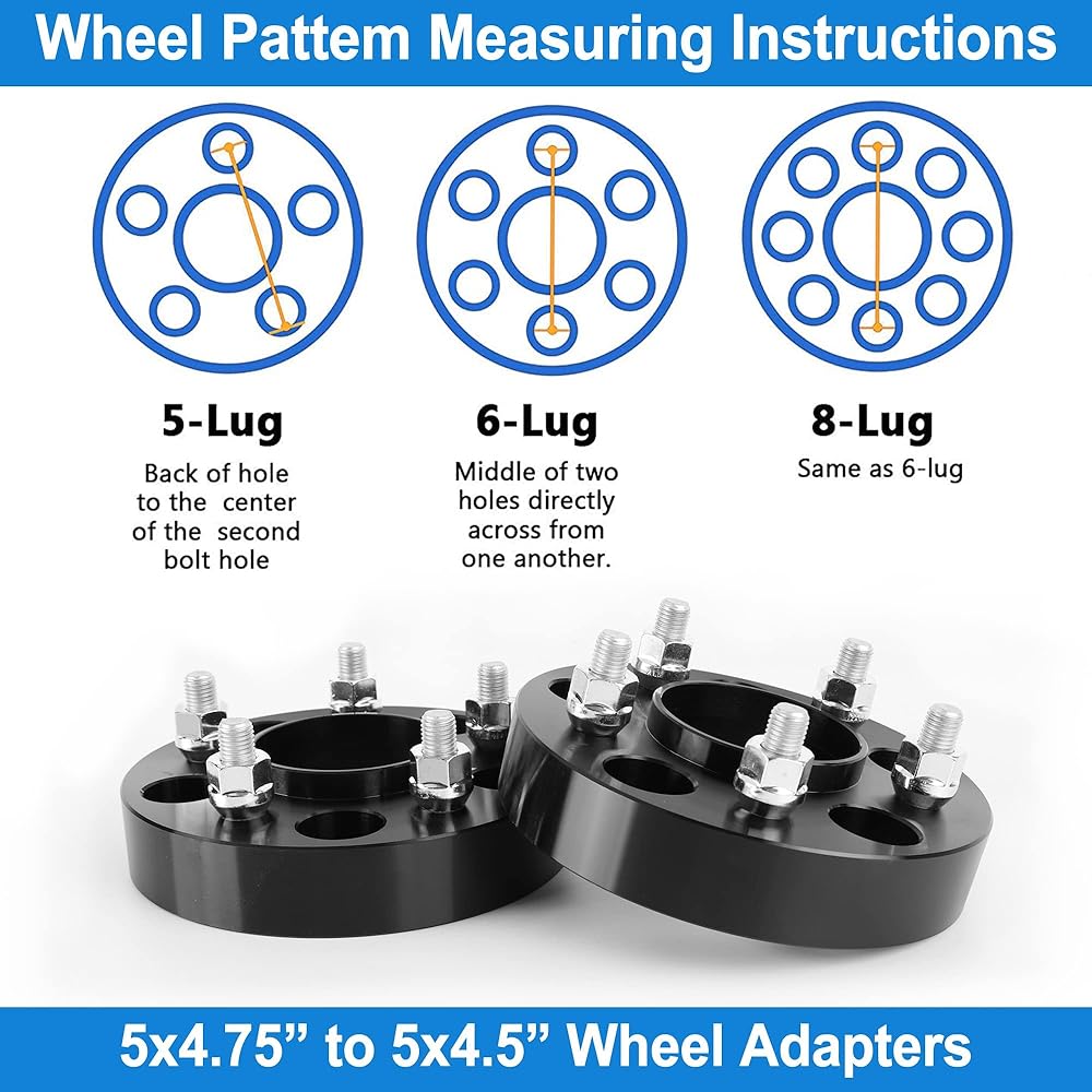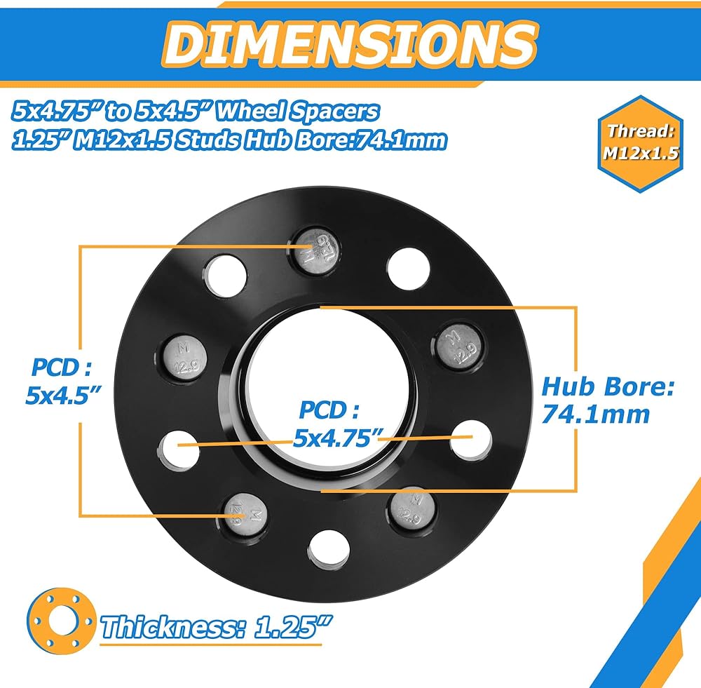 Specs: (shown as second photo) Vehicle Bolt Pattern 5x4.75 (5x120.7mm). Wheel Bolt Pattern 5x4.5 (5x114.3mm). Hub Bore: 74.1 mm. Thickness: 1.25 inch (31.75mm). Thread Pitch: 12X1.5 Threaded Studs.