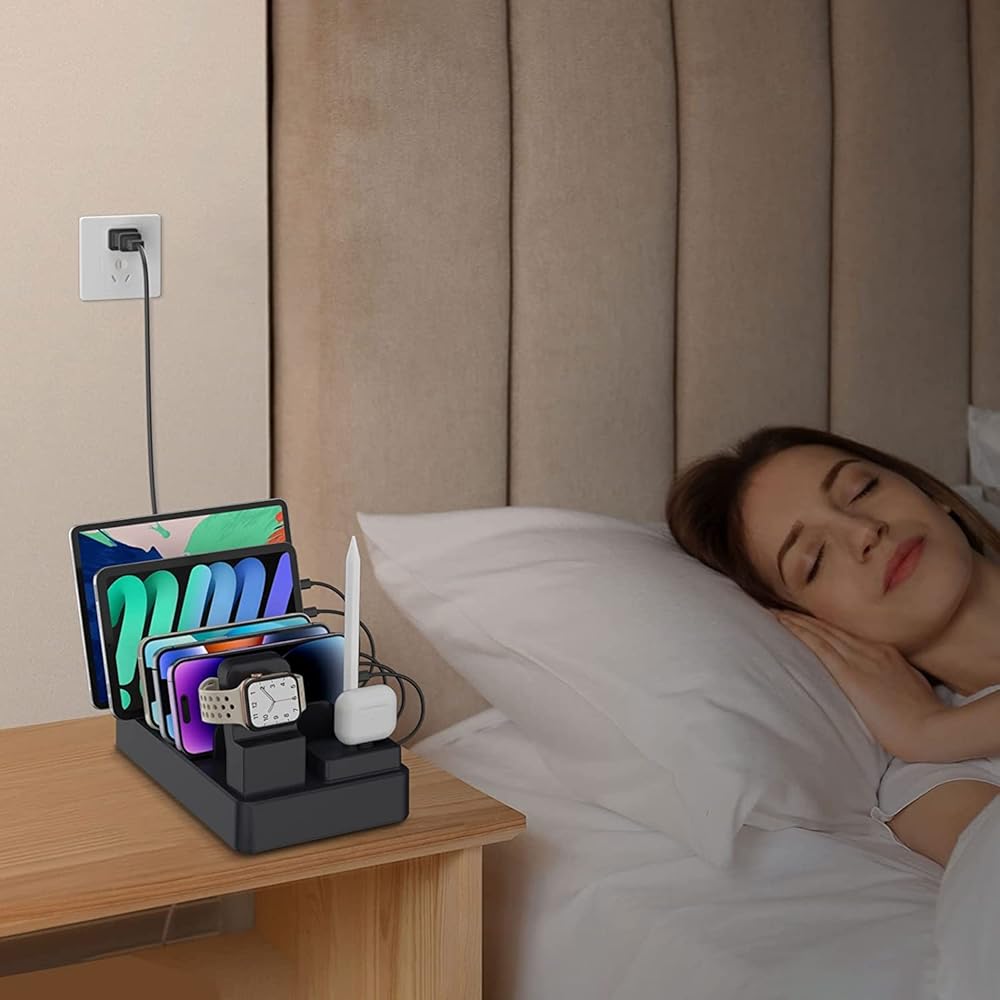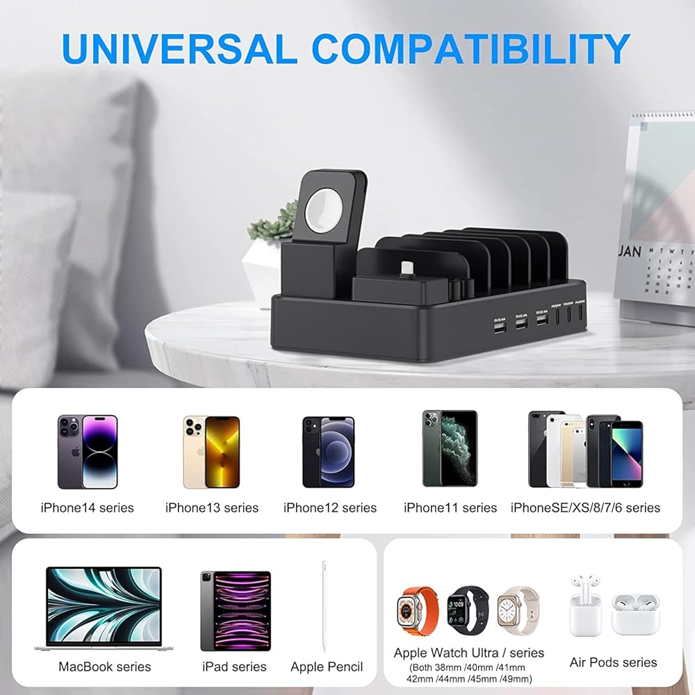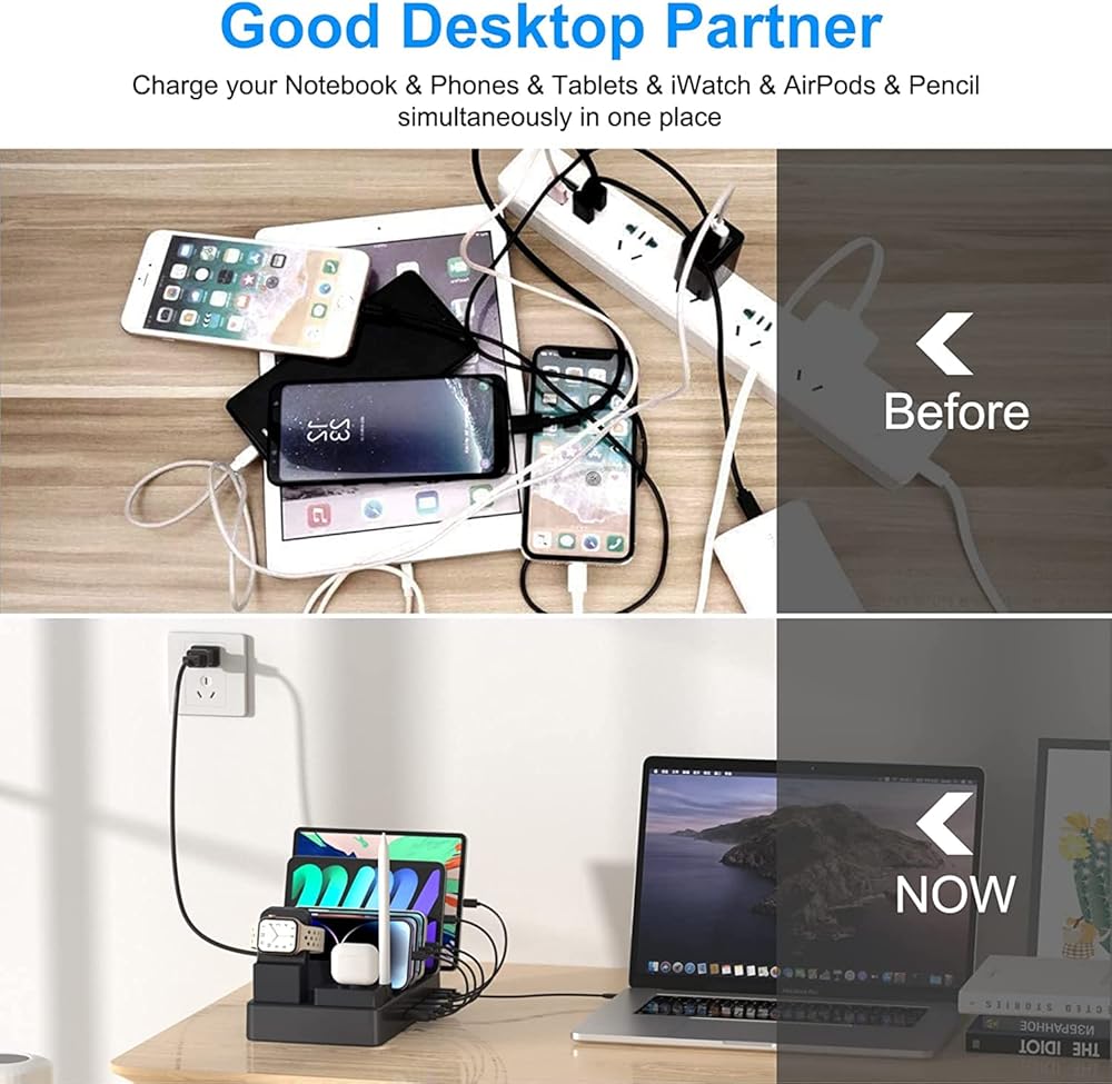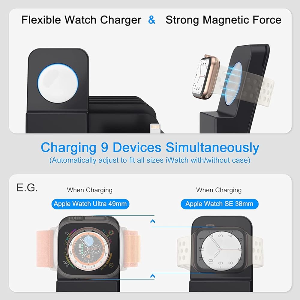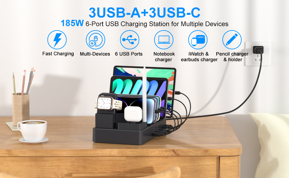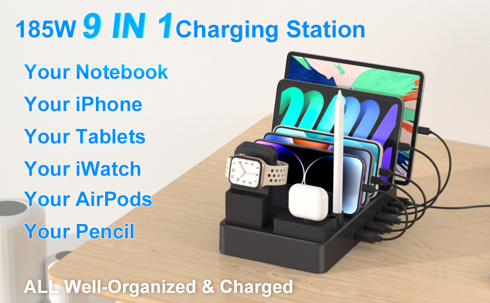 • 【محطة شحن 185 وات 9 في 1】محطة شحن متعددة الأجهزة مصممة مع سماعات الأذن وقلم الرصاص وحامل iWatch (يرجى ملاحظة: شاحن iWatch غير متضمن) قم بتخزين أي مجموعة من 6 هواتف/أجهزة لوحية، وiWatch، وApple air pods، وقلم Apple (الجيل الأول) ) وشحنها في نفس الوقت، محطة شحن واحدة للجميع. من خلال الشحن من خلال محطة شحن USB واحدة متعددة المنافذ، يمكنك تقليل عدد شاحن الحائط USB المطلوب وتحرير المنافذ في منزلك ومكتبك.