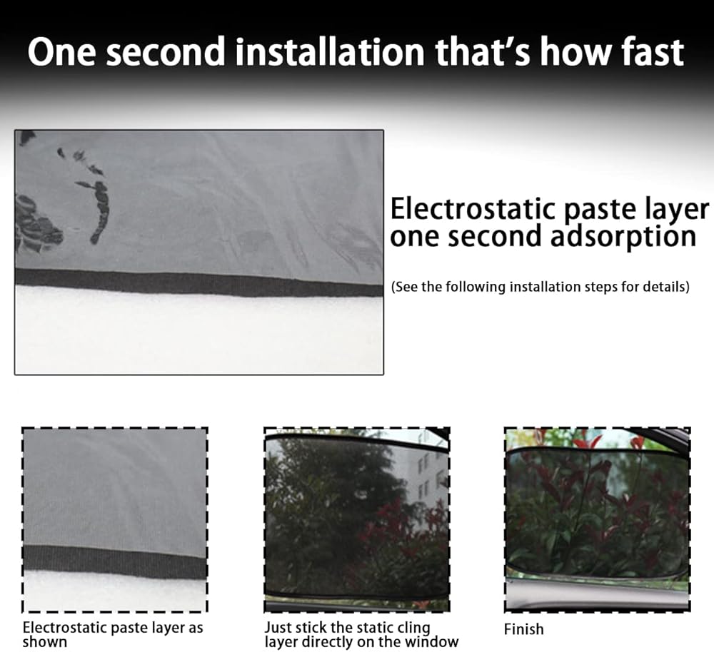 • 【Quick Installation】: The reverse side of the curtain is the electrostatic paste layer, the installation of electrostatic film only takes a few seconds, the curtain will be spread out, with the palm of your hand gently paste on the car window, electrostatic film will be adsorbed on the window, complete the installation. When not in use, it takes only one second to remove, very convenient, you can fold it up for easy storage.