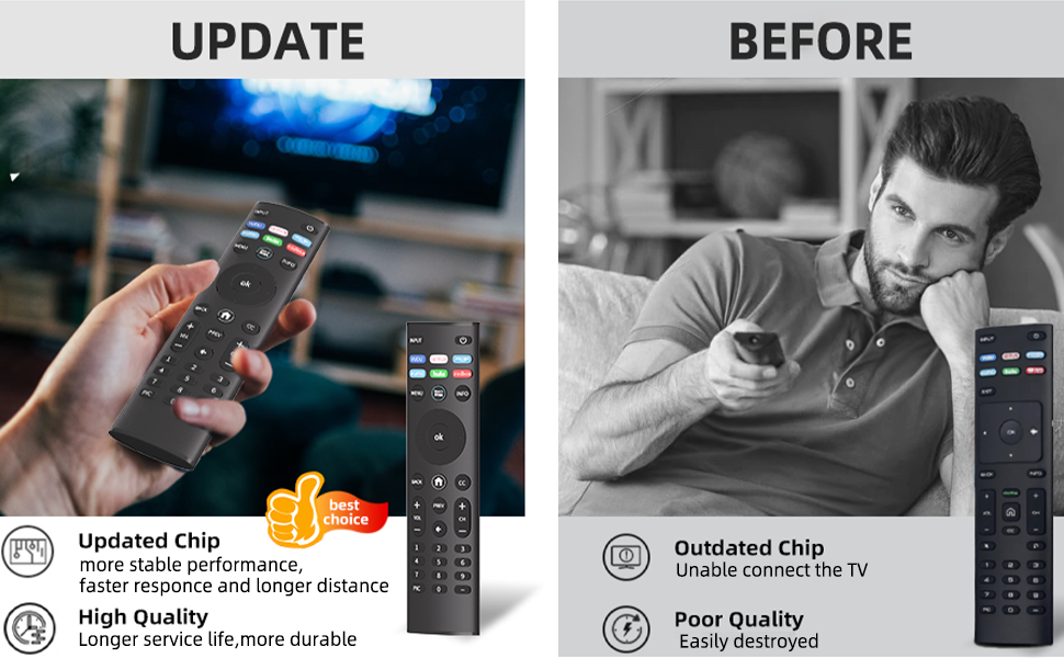 【𝐊𝐞𝐲 𝐅𝐞𝐚𝐭𝐮𝐫𝐞】لقد قام بديل جهاز التحكم عن بعد للتلفزيون الذكي Vizio بترقية مسافة إرسال أطول (≥12 م/ 40 قدمًا)، واستجابة أسرع (0.2 ثانية)، وعمر أكثر متانة وأداء مستقر، واستبدل جميع وظائف جهاز التحكم عن بعد الأصلي، والنقر على الأزرار بدرجة عالية تزيد عن 150,000 النقرات، باستخدام أزرار الاختصار VUDU وNETFLIX وPrime video وXUMO وhulu وredbox