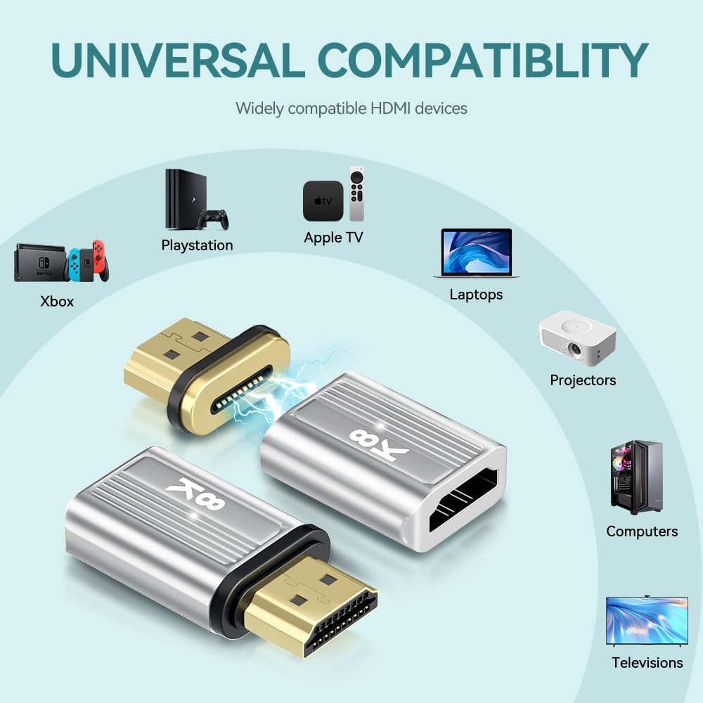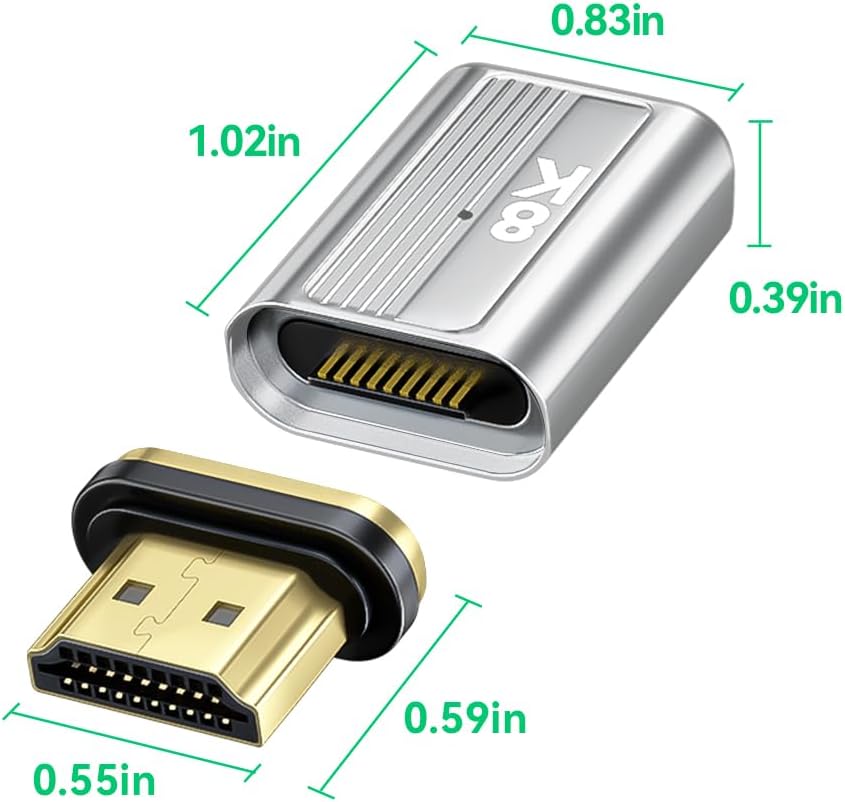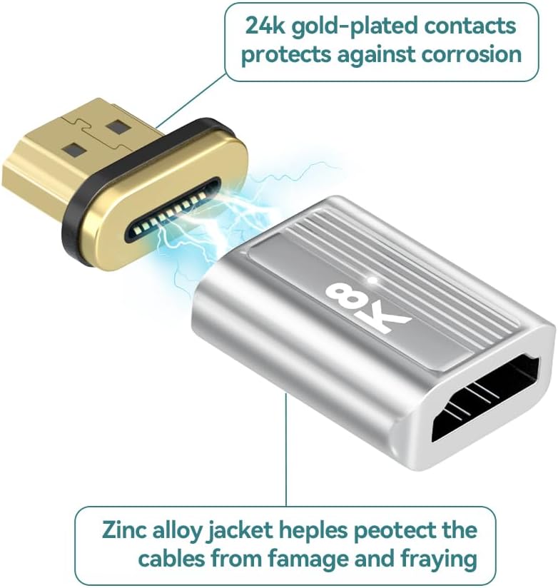 • 【محول HDMI مغناطيسي فائق السرعة 】محول HDMI مغناطيسي إلى HDMI ينقل البيانات إلى سرعات تصل إلى 48 جيجابايت في الثانية، مما يمنحك شاشة أسرع وأكثر سلاسة سواء كنت تشاهد التلفزيون أو الألعاب أو العمل. يقوم محول HDMI 2.1 بنقل الصوت والفيديو والصور بسرعة البرق دون انتظار التخزين المؤقت. التوصيل والتشغيل، لا توجد حاجة إلى برامج تشغيل مثبتة مسبقًا. لا حاجة للتمييز بين المدخلات والمخرجات.