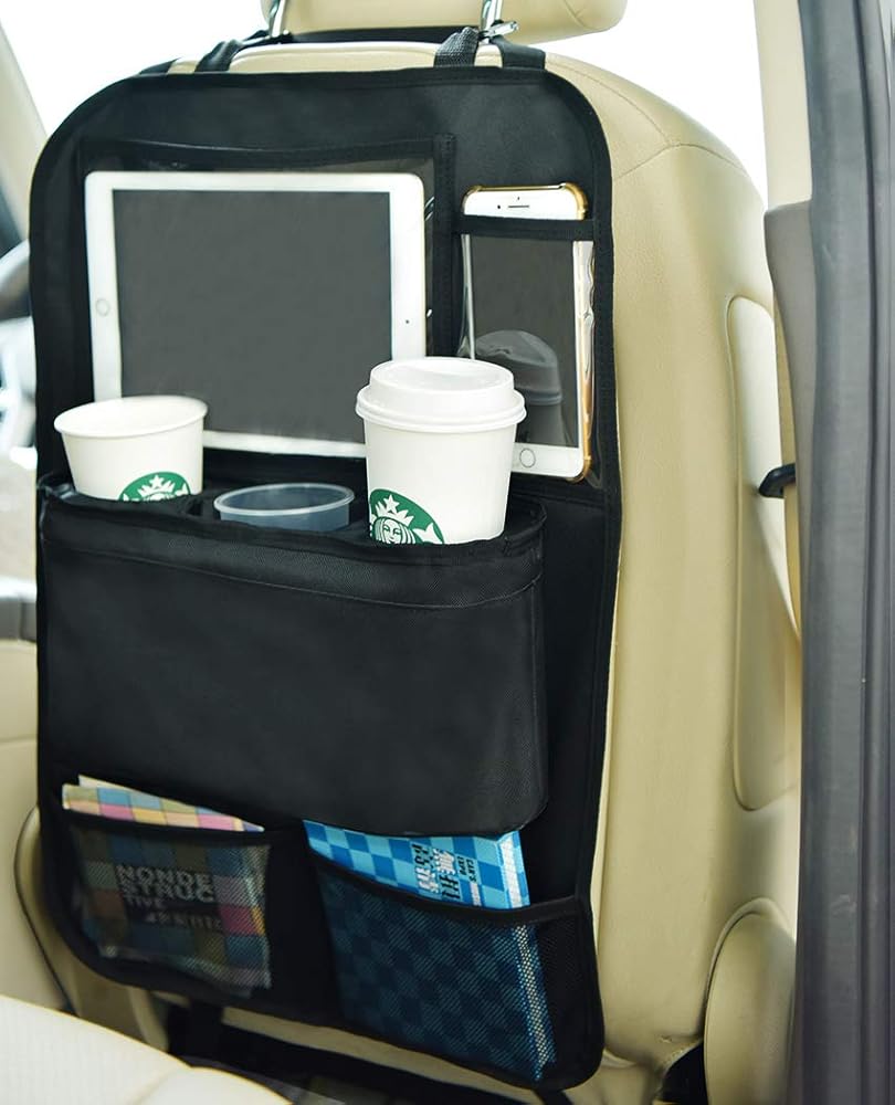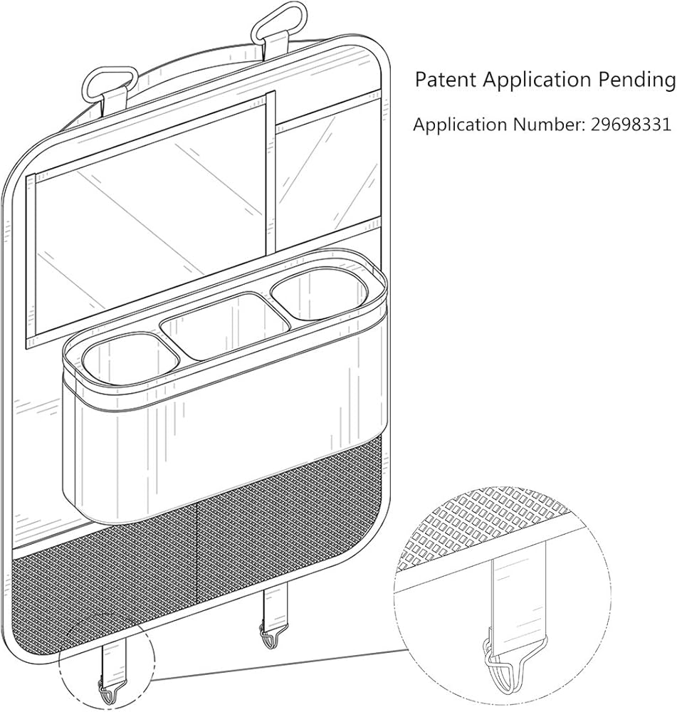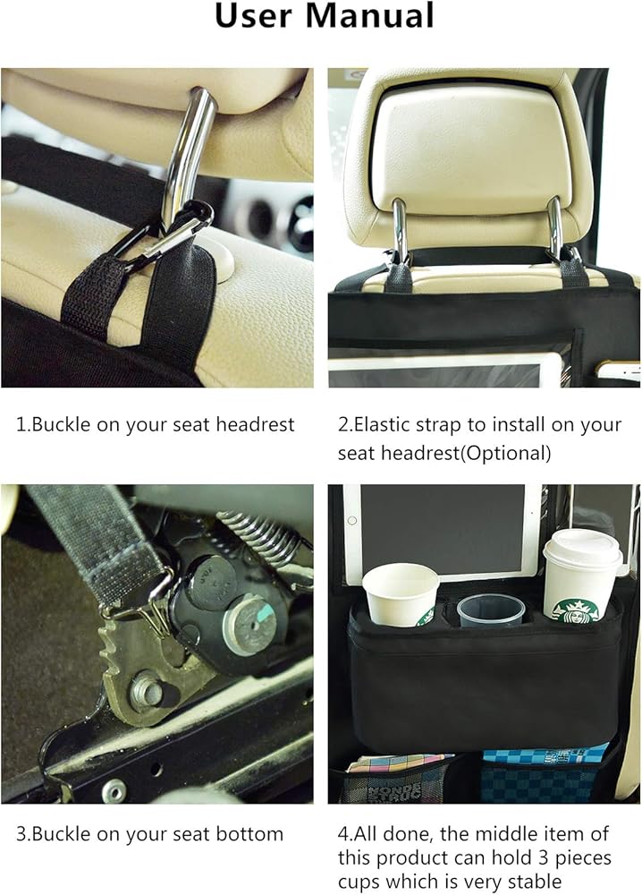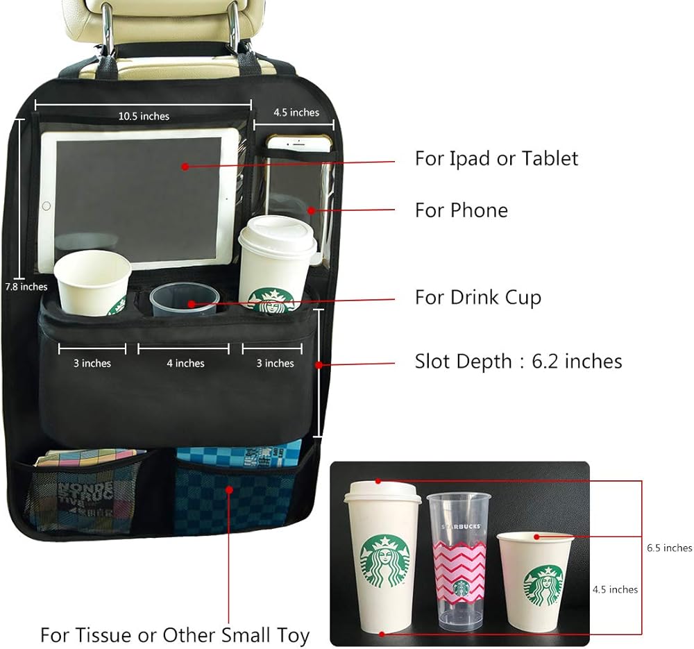 متعدد الوظائف: يوفر منظم المقعد الخلفي للسيارة حامل وسادة شفاف في المنتصف العلوي وحقيبتين شبكيتين على جانبي حامل الوسادة. يوفر المقعد الخلفي للسيارة أيضًا حامل مشروبات قوي يمكنه استيعاب ثلاثة أكواب من المشروبات. يوفر المقعد الخلفي للسيارة أيضًا حقيبة شبكية كبيرة يمكنها تخزين الكتب أو الأغراض الشخصية أو الألعاب.
