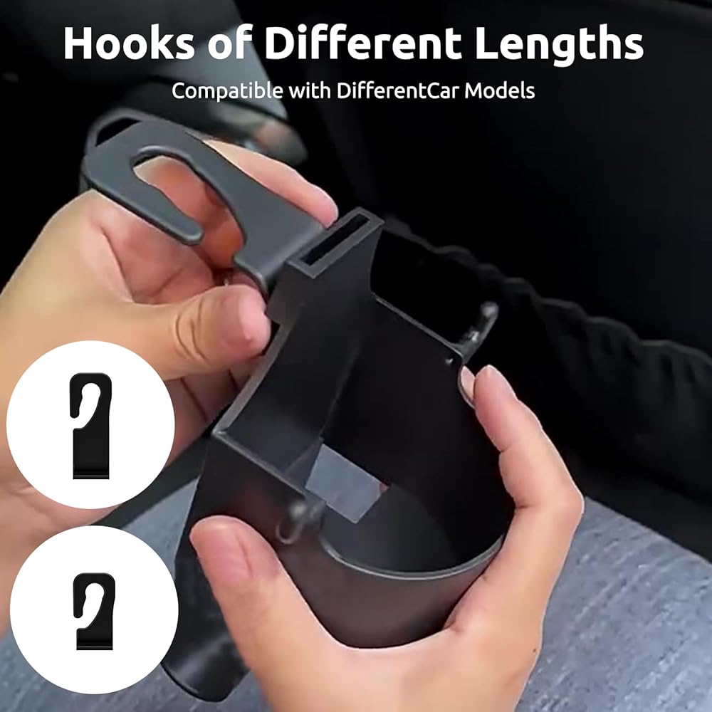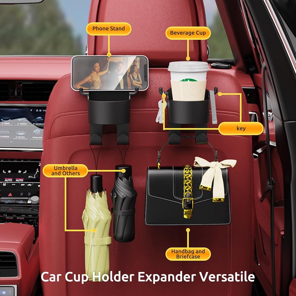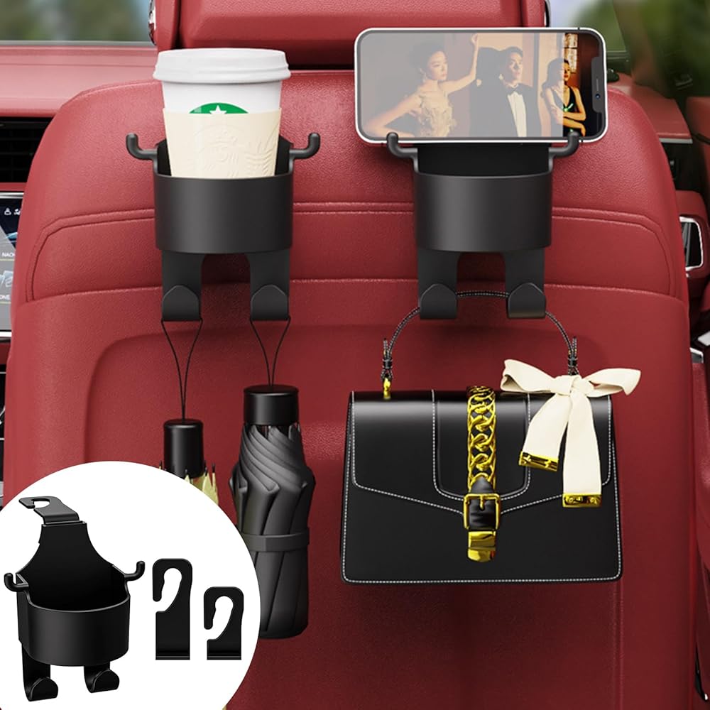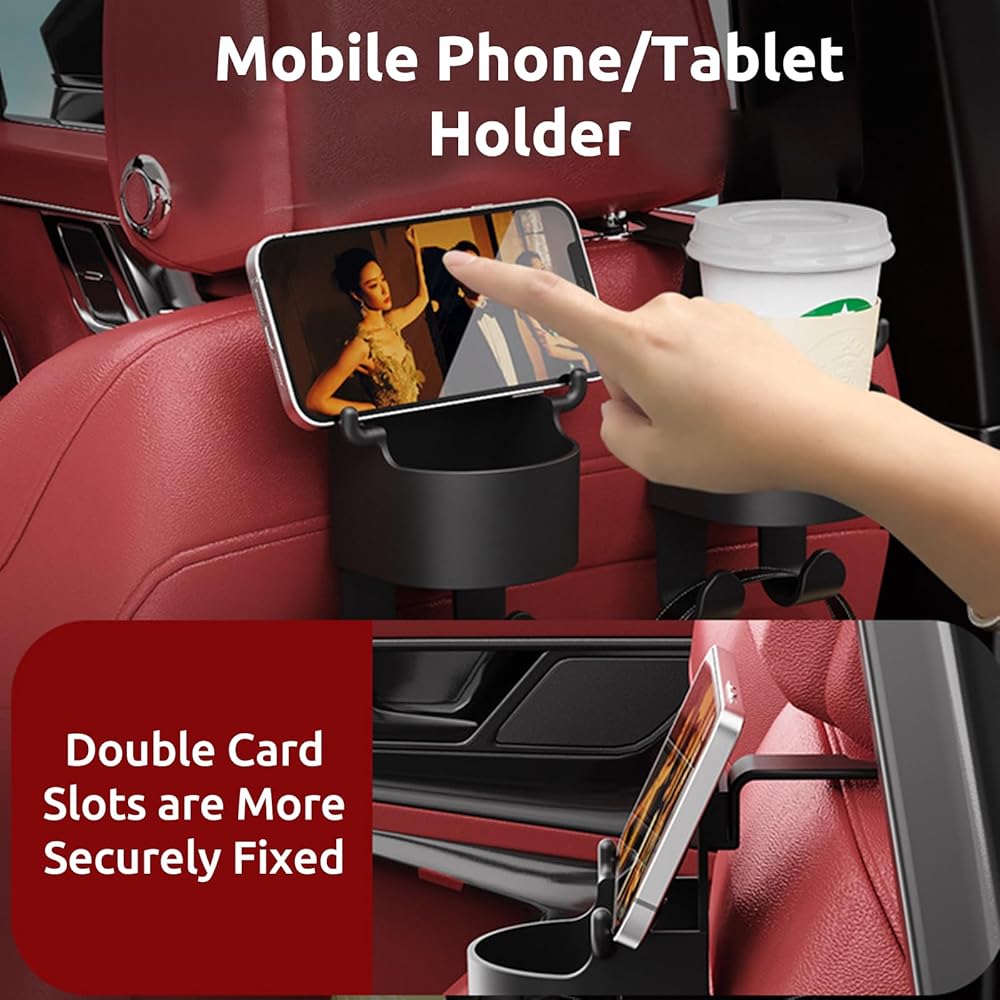 3 in 1 Car Seat Headrest Cup Holder with Hooks: This multifunctional hook for the car seat back combines a cell phone holder, car cup holder, and seat hook in one design. It's a powerful and easy-to-use solution to save seat space and maintain a neat and comfortable car interior.