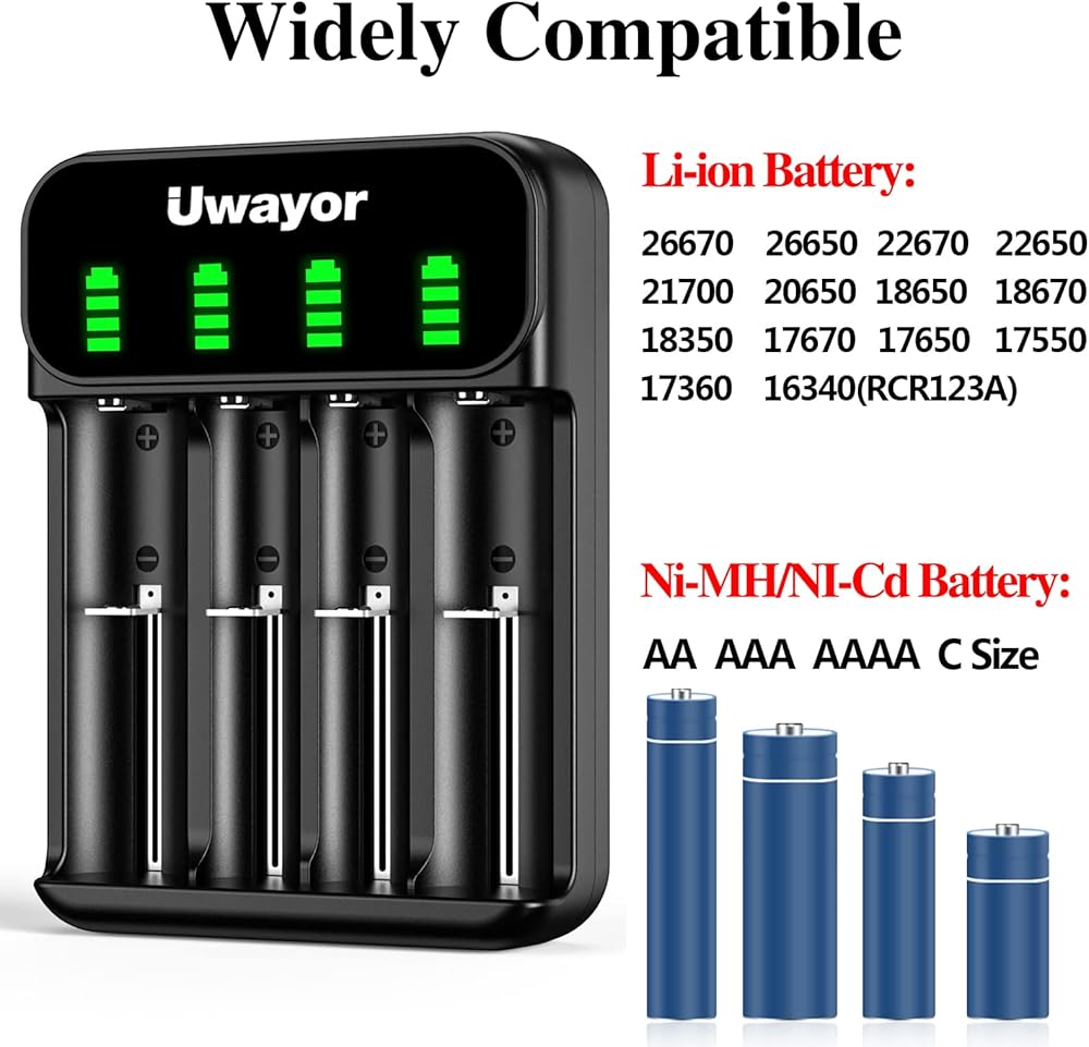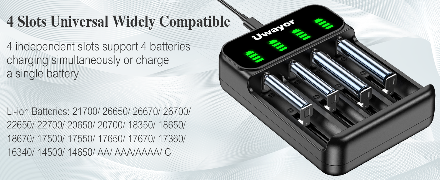 • [4 فتحات + شاشة LED ذكية] 4 فتحات مستقلة تدعم شحن 4 بطاريات في وقت واحد، أو شحن بطارية واحدة. يمكن أن تظهر شاشة LED الذكية أن البطارية قيد الشحن أو مشحونة بالكامل، ويمكن إزالة البطارية عندما لا تحتاج إلى إعادة شحنها. شاحن البطارية 18650 الخاص بنا صديق للبيئة وموفر للطاقة ويمكن استخدامه بأمان وأمان.