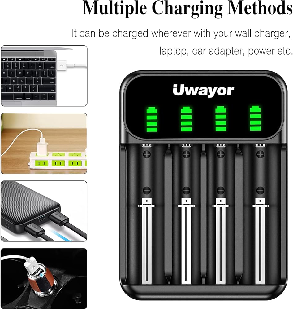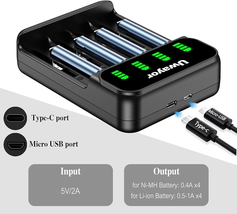 • 【حماية شحن آمنة】الإدخال: 5 فولت/2 أمبير، الإخراج: لبطارية ليثيوم أيون: 0.5-1 أمبير ×4، لبطارية Ni-MH: 0.4 أمبير ×4. شاحن البطارية الذكي لدينا آمن ومحمي بالكامل ضد الشحن الزائد، والدوائر القصيرة، والتفريغ الزائد، ودرجة الحرارة الزائدة، والتيار الزائد، والجهد الزائد، مما يوفر حالة شحن آمنة وموثوقة.