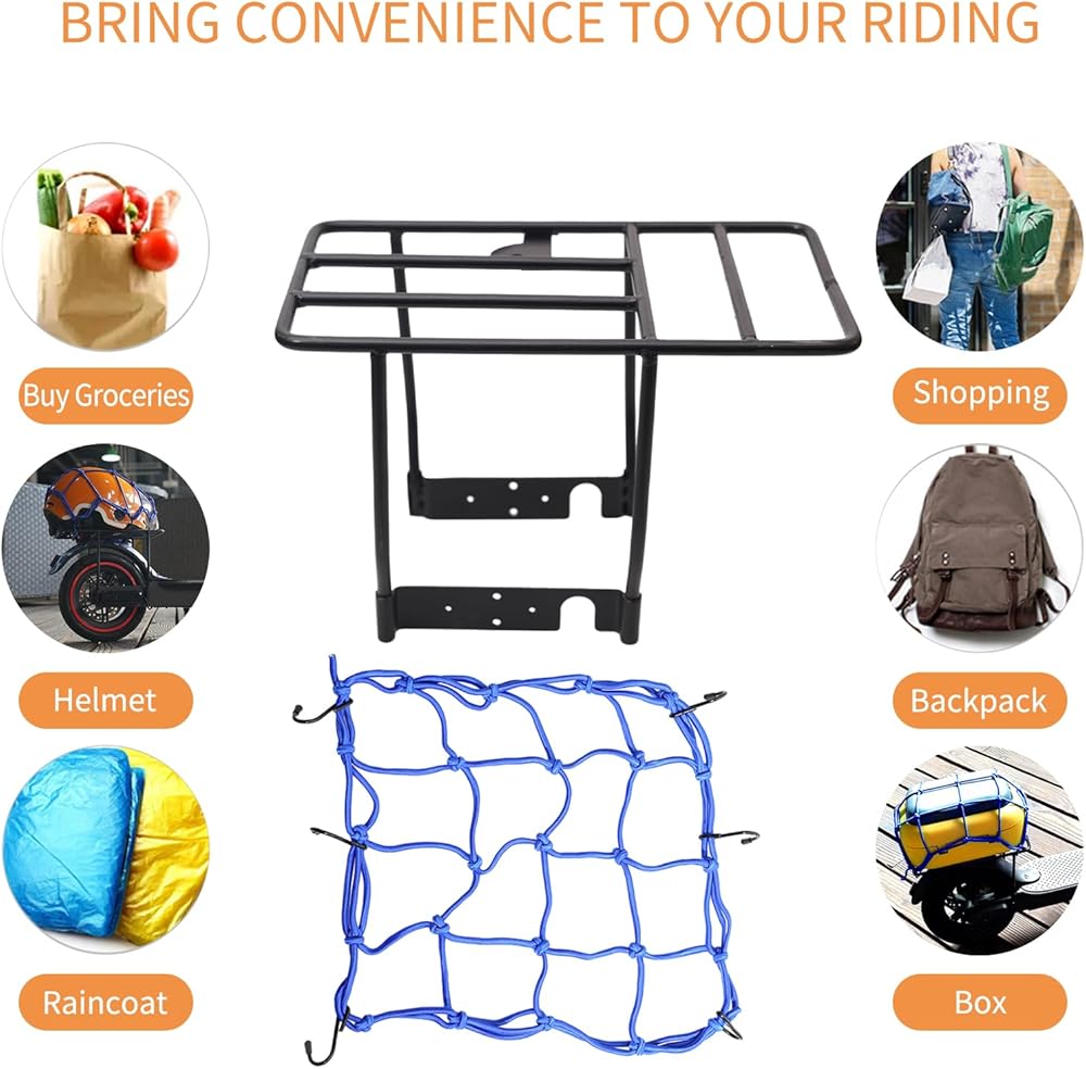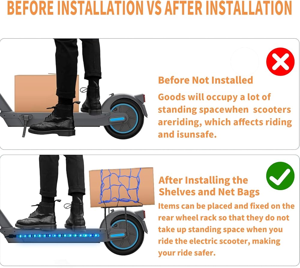مع شبكة شحن السكوتر: يمكنك وضع الخوذات والعبوات وأدوات التسوق وحقائب الظهر ومعاطف المطر في الرف الخلفي لملحقات السكوتر الإلكتروني، ولها سعة تحميل أكبر وثبات أعلى، وتحمي بضائعك بشكل فعال من التلف والتناثر والضياع.