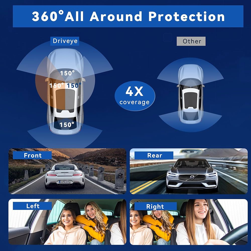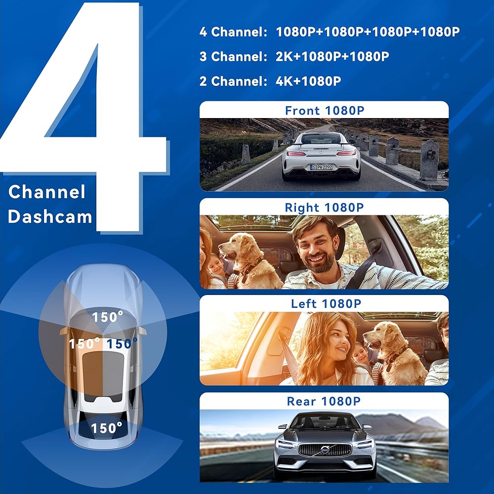• 【4 Channel WiFi 360° All Sides Dash Cam】D4 is a 4-channel dash camera equipped with ultra-wide-angle lens 150°*4 field of view, 4 channels can be rotated and adjusted angles, ensuring 360° full protection. Dash cam simultaneously monitors the front, interior, and rear of the vehicle, 3 video recording modes (4K+1080P / 1440P+1080P+1080P / 1080P+1080P+1080P+1080P) are available for you to freely choose resolution according to your needs.