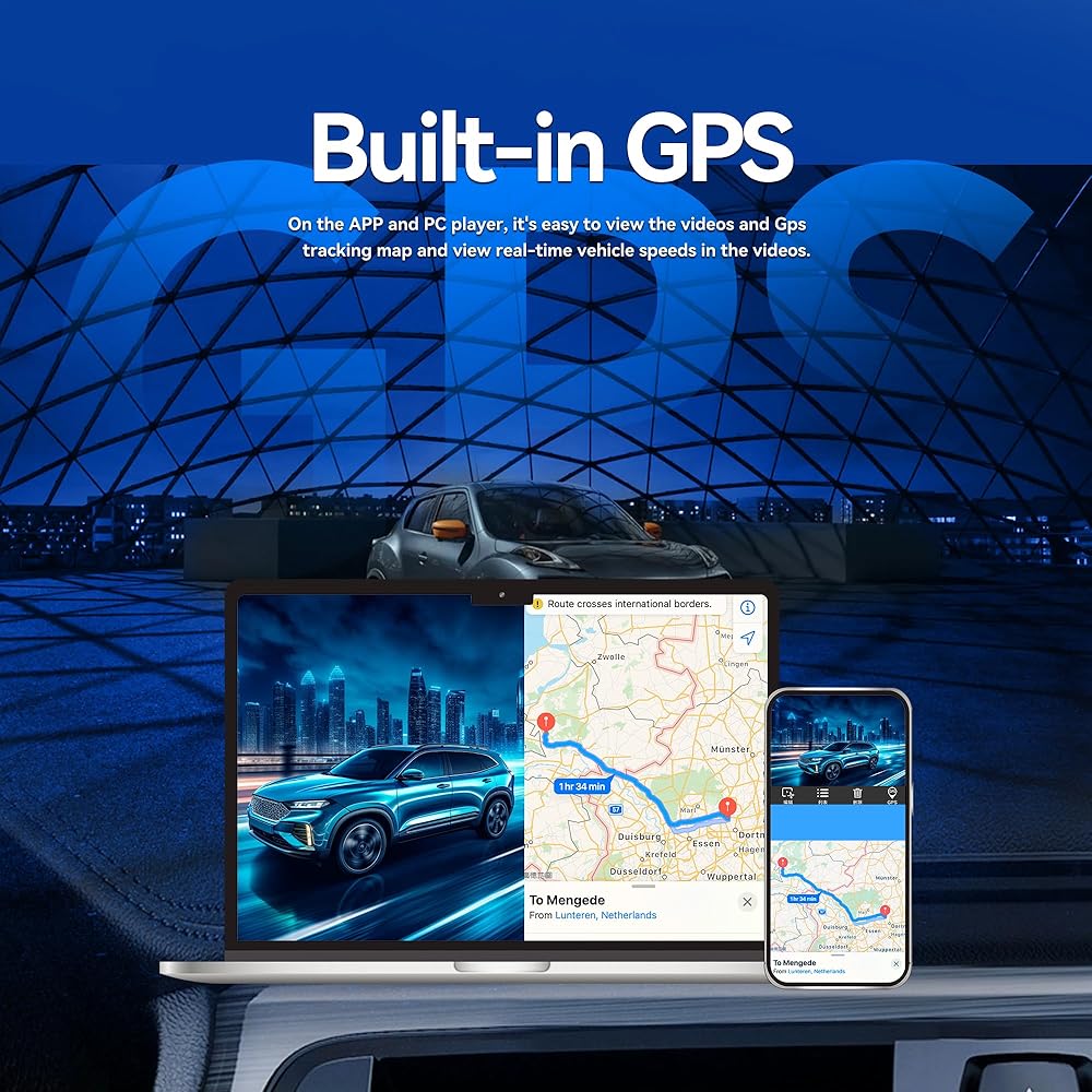 • 【BUILT-IN GPS and Wi-Fi】GPS accurately records your driving location and speed. View your driving route and tracker on google maps via GPS Player. Share your driving experiences in real-time with friends, family, or insurance companies. Car recorder built-in GPS provides accurate tracking of your vehicle's location, speed, and route. WIFI CONNECT: View, save, and share dash cam recordings wirelessly on your mobile device with the use of an app interface.