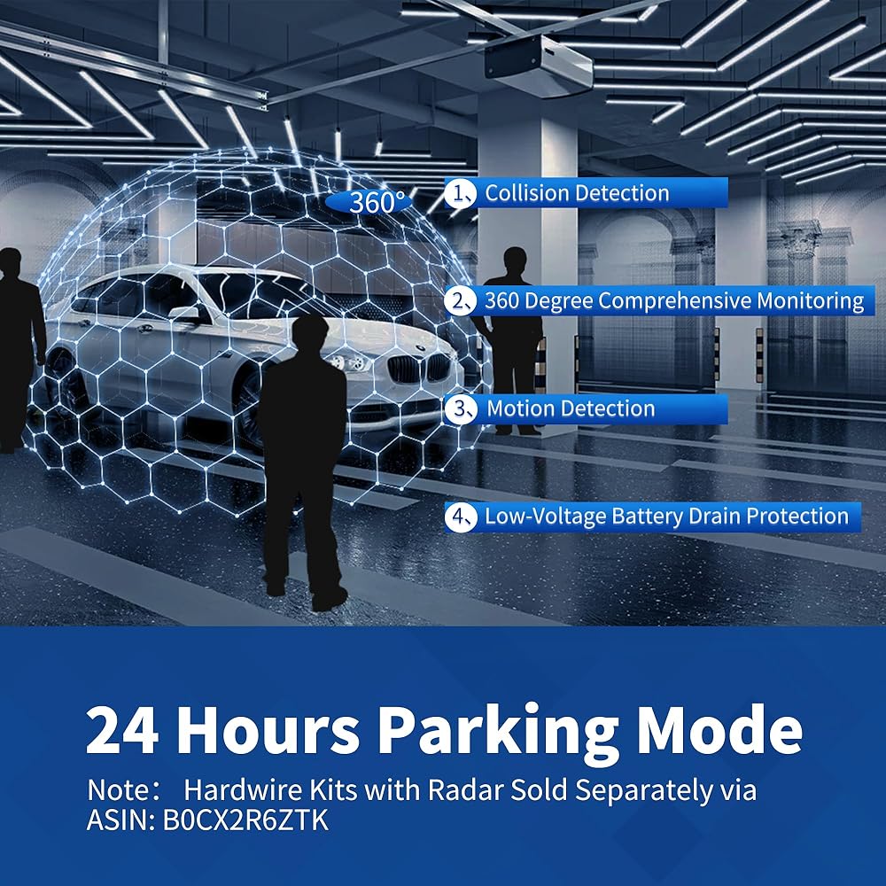 【24 Hours Parking Monitoring】When you park and turn off your vehicle, the Driveye D4 dashcam will automatically switch to parking mode, enabling 24-hour surveillance recording. The dash camera for cars has time-delay recording function to record continuously with low power consumption and low frame rate, providing 24 hours protection for your car. Please note that the parking monitoring function requires the purchase of a separate hardwire kit. (ASIN: B0CX2R6ZTK)