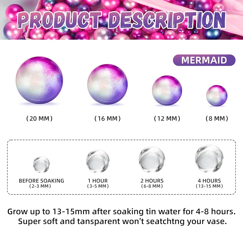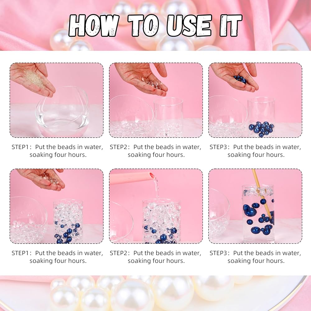 【Note】The Pearls DO NOT FLOAT IN WATER ALONE and you will need our Transparent Water Gels to float them. The clear water gels are tiny clear color balls at first, add water to the transparent water gels, Soaking for 4-6 hours to hydrate and expand, and as a result they will become Transparent Gels that will help the pearls looks floating.