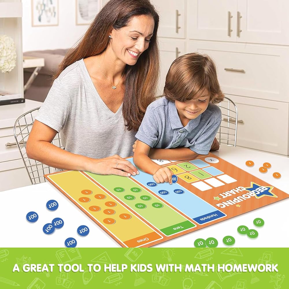 إعادة التجميع الرئيسية: تعليم وتعزيز مفهوم إعادة التجميع أثناء الإضافة والطرح بطريقة جذابة ومهارات حل المشكلات. الحصائر والرقائق متناسقة الألوان ومثالية للعمل الجماعي الصغير أو الممارسة المستقلة أو مراكز التعلم.