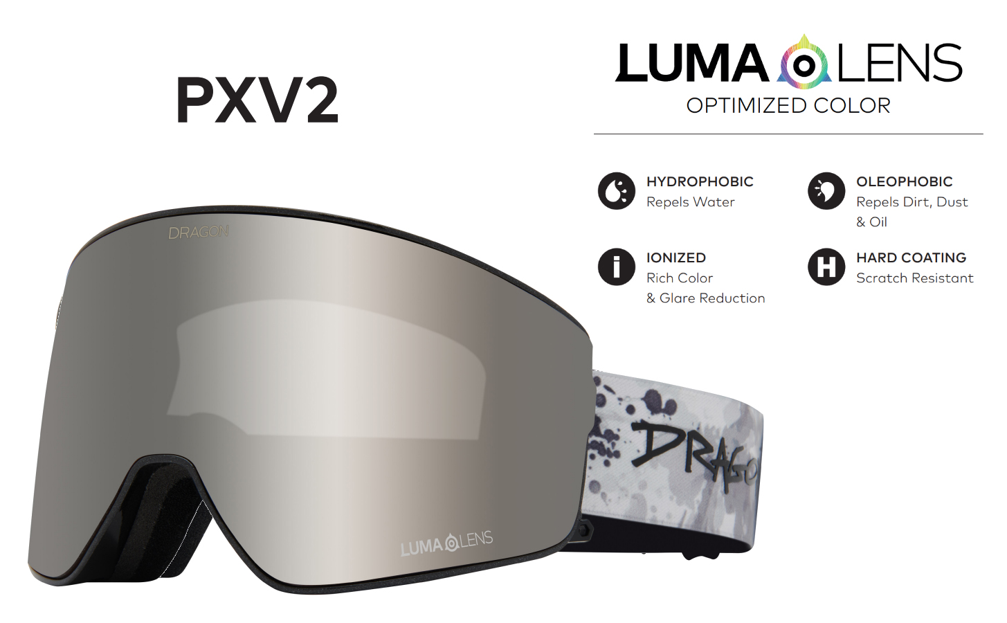 The latest in our premium offering, the PXV2 goggle is the distillation of years of goggle design. We took our groundbreaking Panotech design and fused it with the utility and ease of our Swiftlock lens changing technology. It's sized in the sweet spot: slightly smaller than the PXV and larger than the best-selling NFX2. And of course, the PXV2 utilizes our best-in-class Lumalens color optimized lenses and armored venting. This goggle utilizes features derived from Dragon's patented Advanced Projects X (APX) technology.