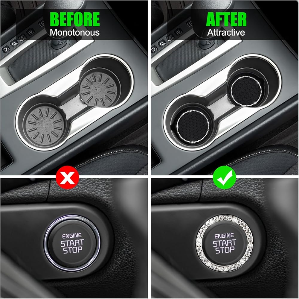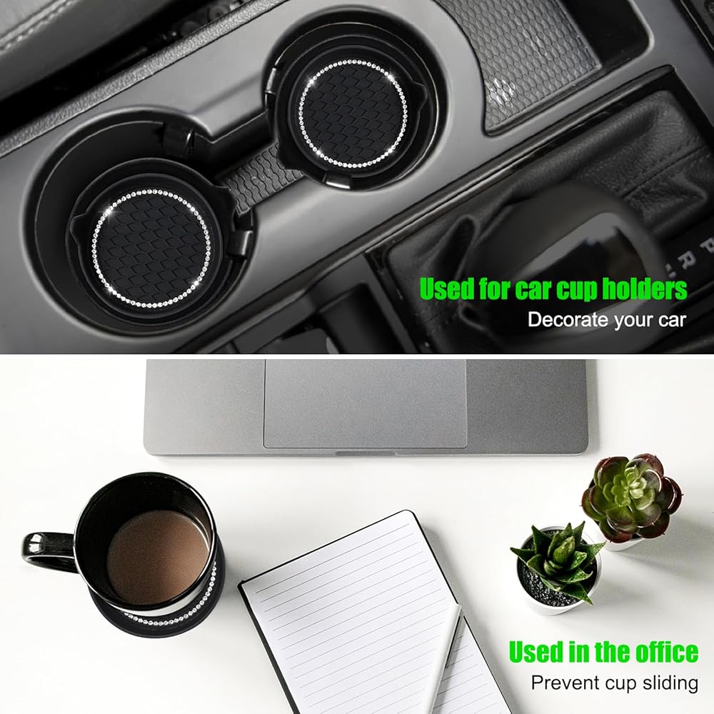Unique design: The coaster is a honeycomb grooved texture design that is personalized with a stylish and multi-functional minimalist design. This product also comes with a stylish car push button bling ring, the bling design is perfect for your car interior, you can't miss these practical and beautiful cup holder coasters.