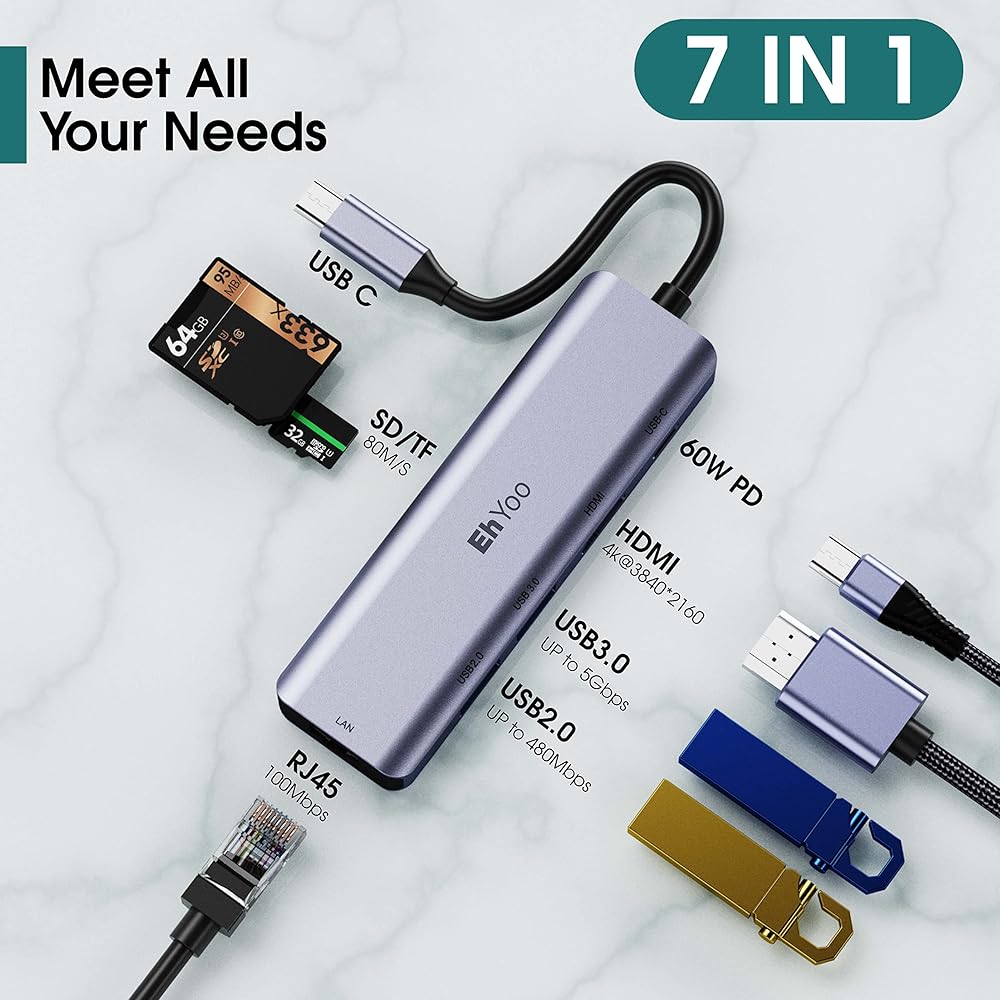 USB C Hub Multiport Adapter, EhYoo 7-in-1 USB-C Hub with 4K/1080p 60Hz , RJ45 Ethernet, 60W Power Delivery, SD/TF Card Slots, 2x USB 3.0 5Gbps Data Ports, for ROG Ally, Laptops, Smartphones, MacBook Pro, MacBook Air, iPad Pro, XPS, Switch, Steam Deck