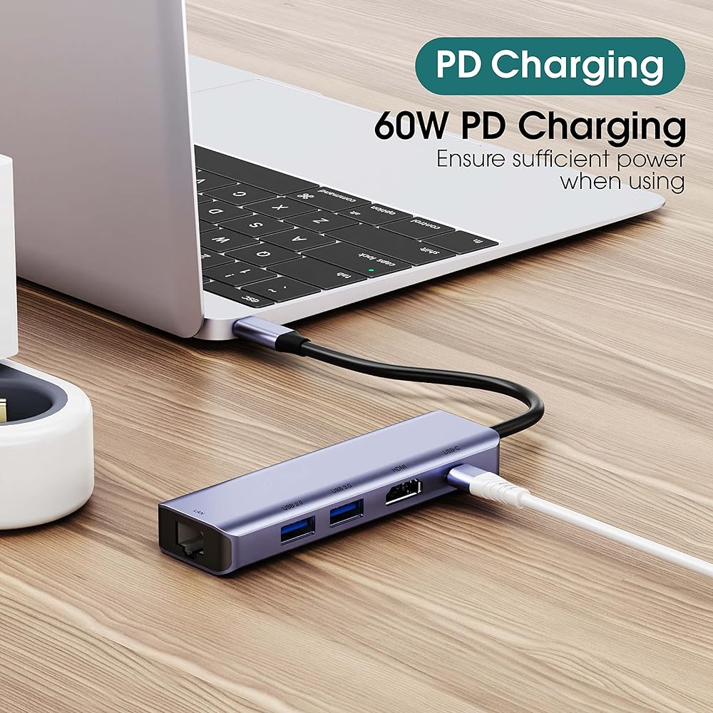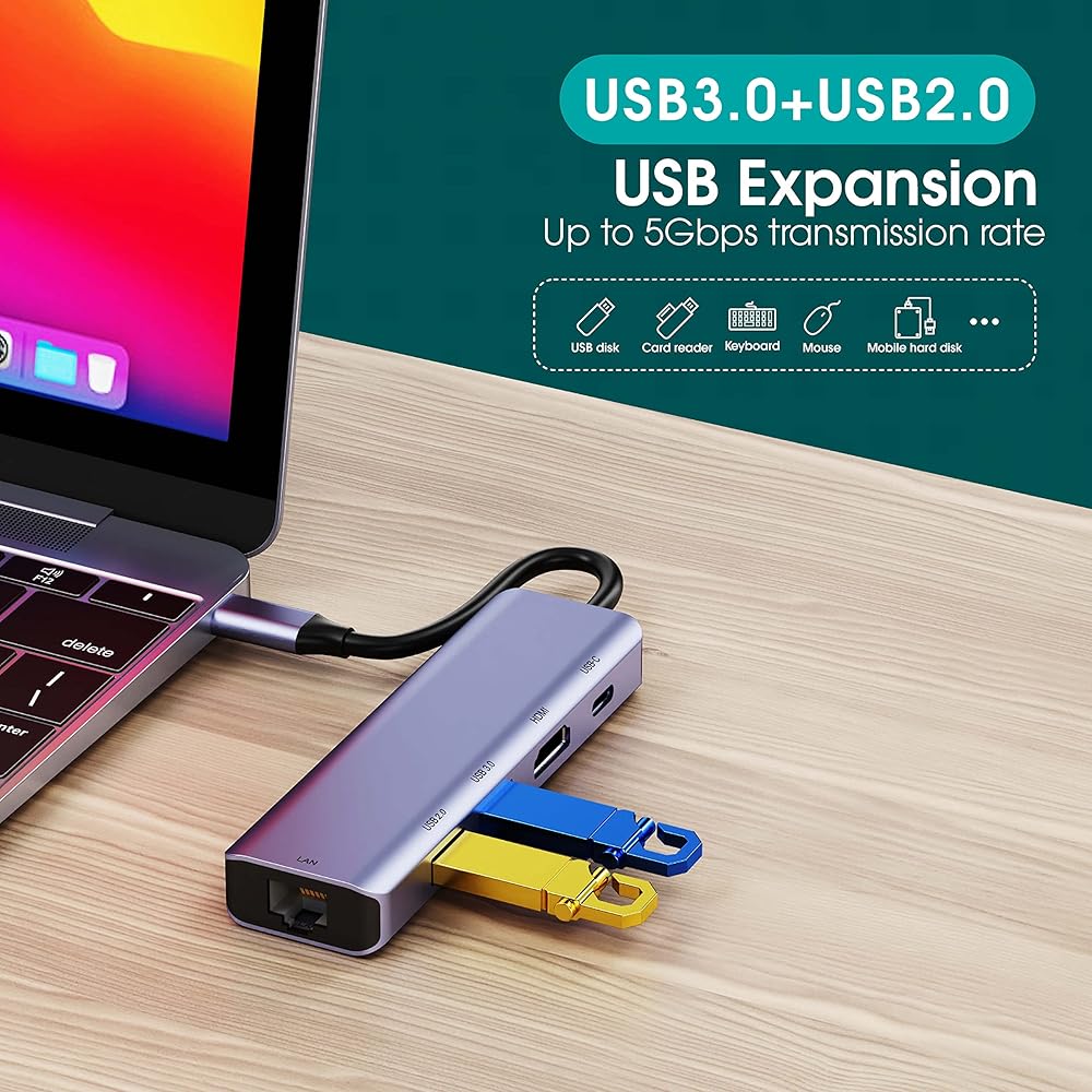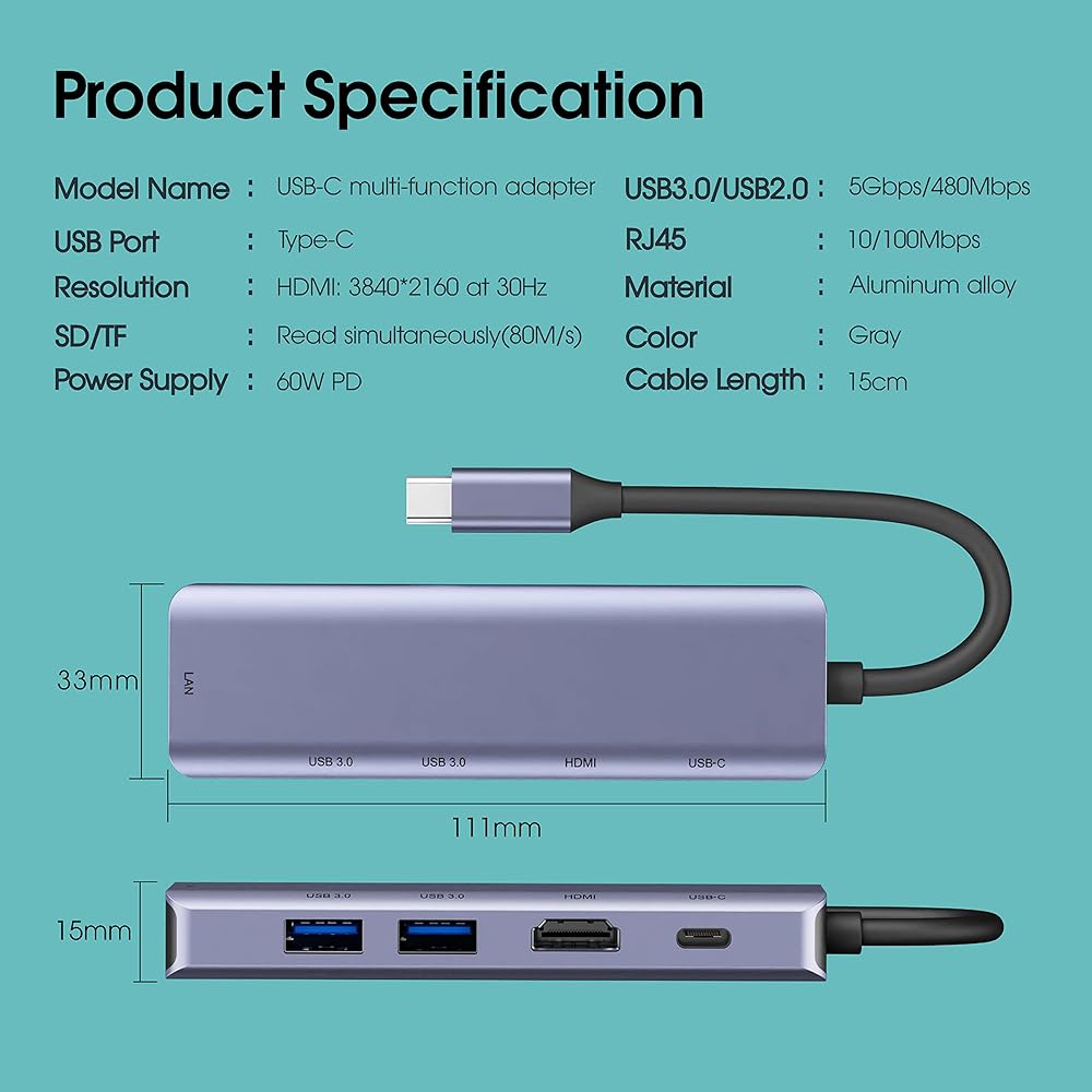 USB C Hub 7 in 1-Massive Expansion: Extends your devices' USB-C port to include 1 4K@30Hz/1080p@60Hz HDMI output port, 1 60W PD Charging port, 1 100MBps RJ45 Ethernet port, 1 SD card reader, 1 TF card reader, and 2 USB-A 3.0 ports, allows you to keep a sleek workspace. We suggest connecting the hub to the main device first, and then connect the accessories to the ports