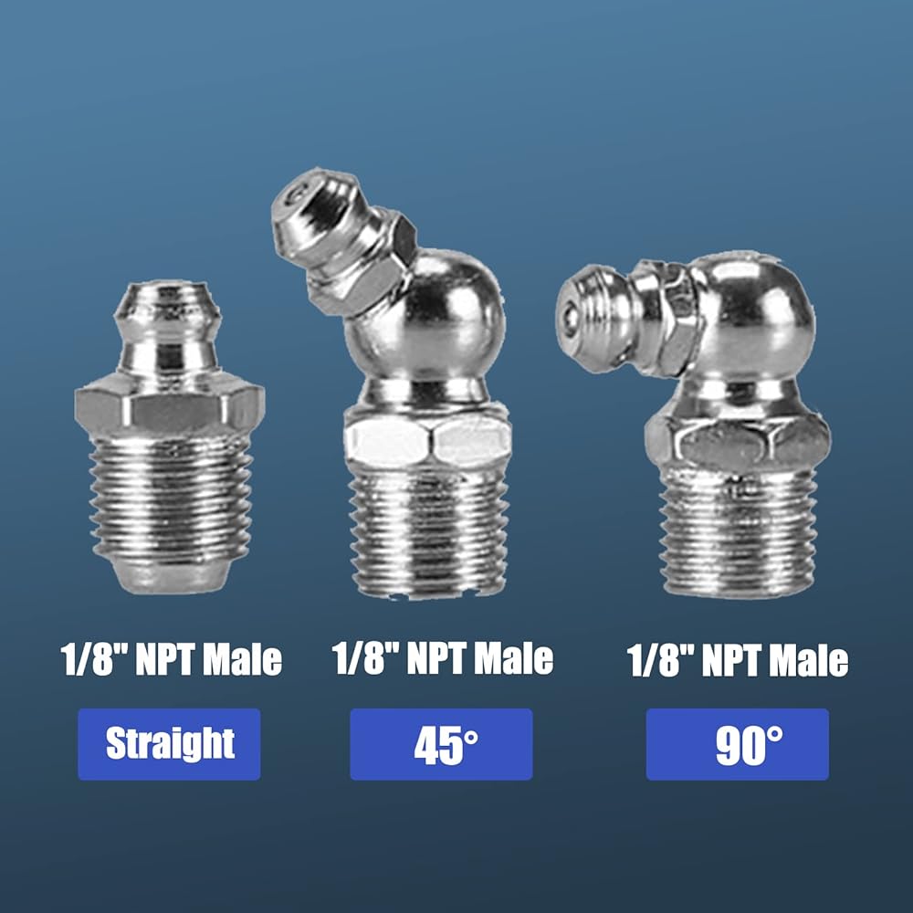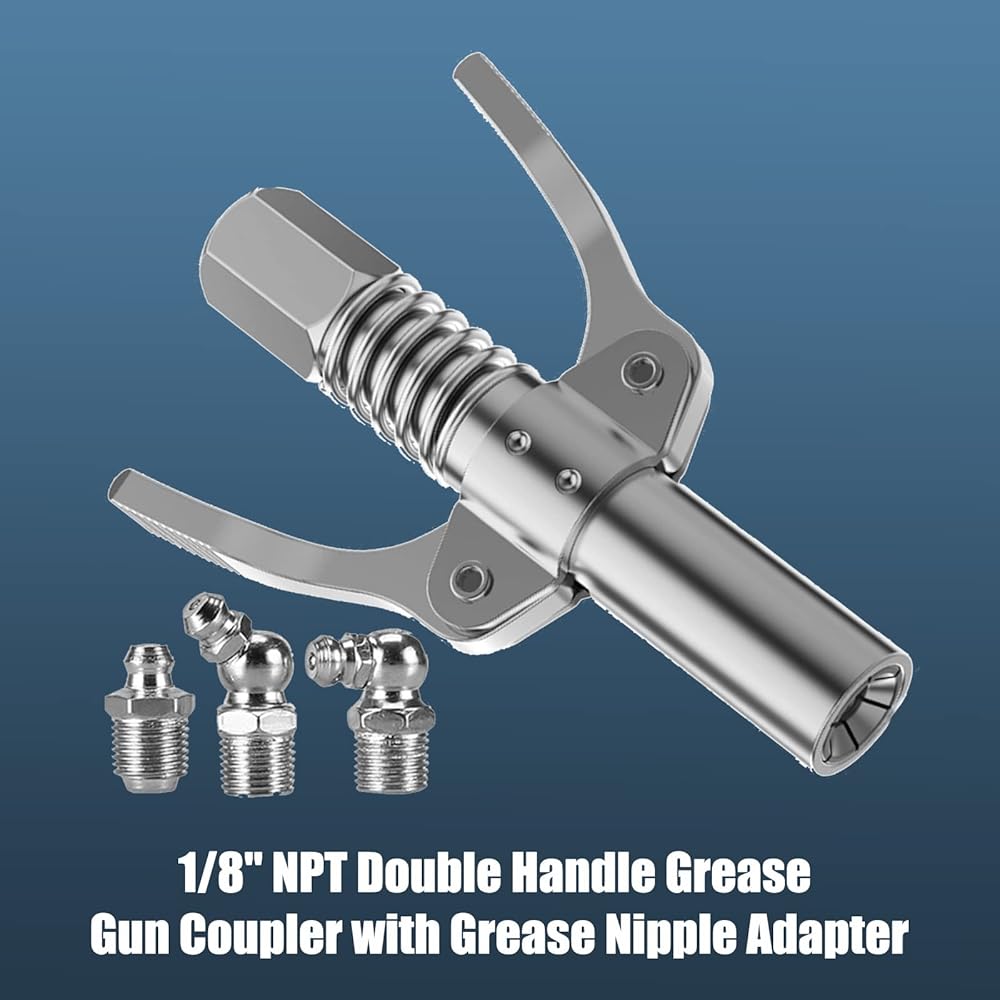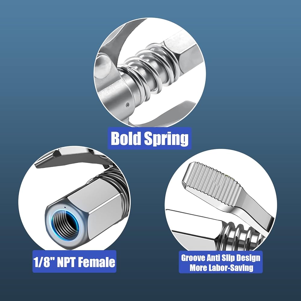 🚜WIDE APPLICATION: Compatible with All 1/8" NPT standard, mini, battery, pneumatic, manual Grease Guns and Zerk Fittings. This Strong grease gun tool is ready for use in automotive repair, job site large machinery and axles and drive trains, it is also great for lubricating farm tractors, plows, stump pullers, disc harrows, seeders and more.