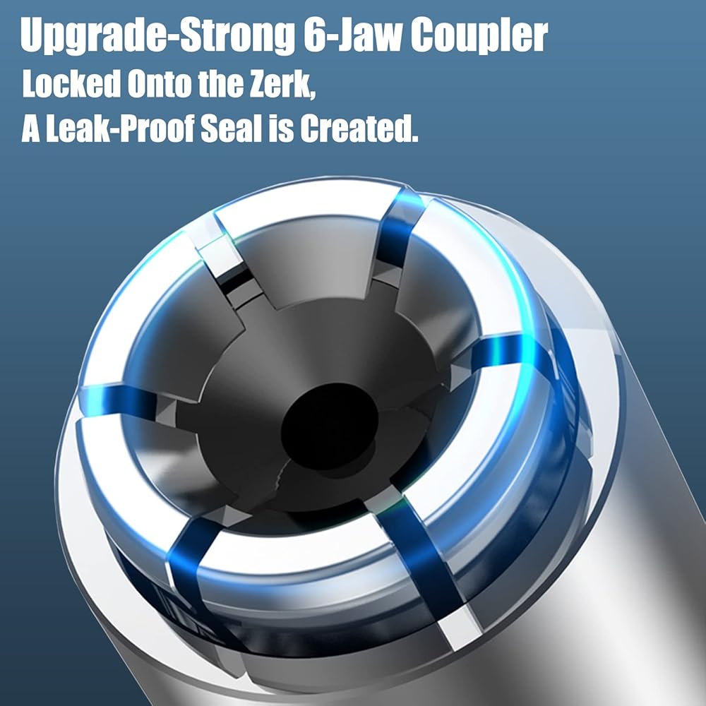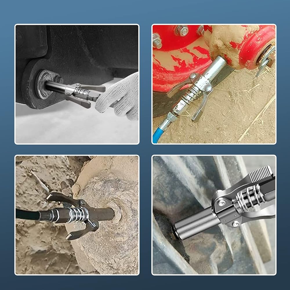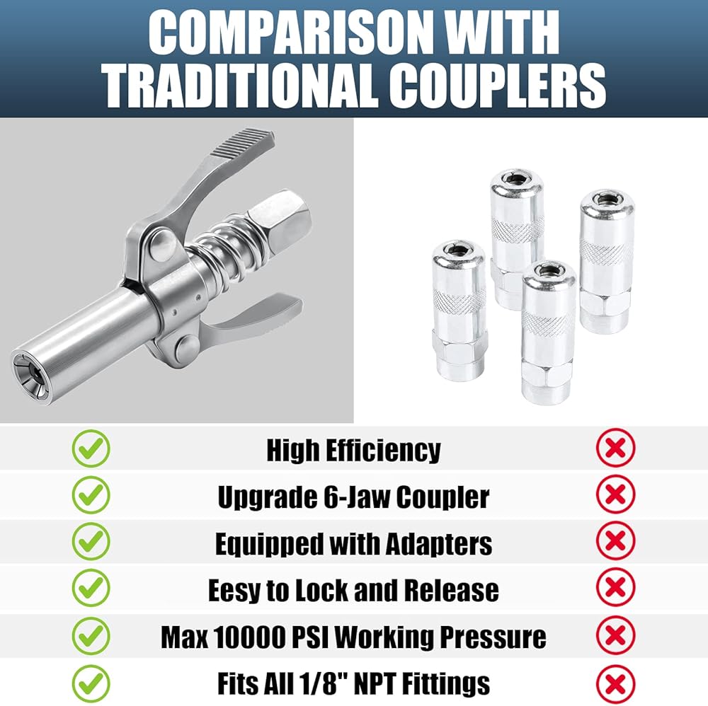 🚜UPGRADE GREASE COUPLER: The grease gun coupler is made of upgraded material alloy steel, optimizing the thickness of the steel and upgrading the 6-jaw bite lock on the original basis. Patented Mechanical double-gear structure grease gun tip, light and flexible, save more effort and is less wear-resistant, making a longer service life.