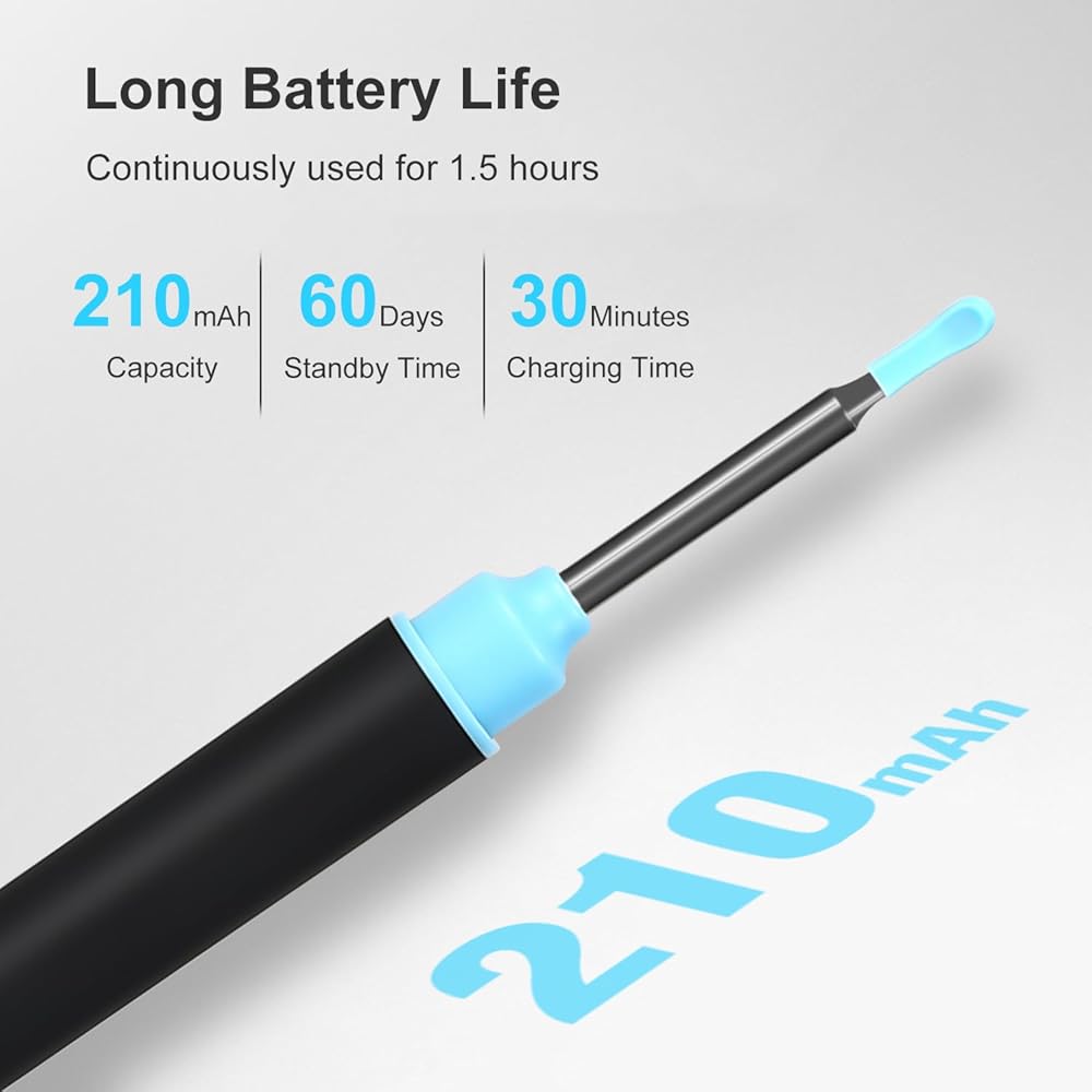• سعة كبيرة وحقيقية: منظف الأذن المزود بالكاميرا والضوء يتمتع بسعة حقيقية تبلغ 210 مللي أمبير في الساعة. يمكن أن تعمل بشكل مستمر لمدة 1.5 ساعة. قل وداعًا للشحن المتكرر.