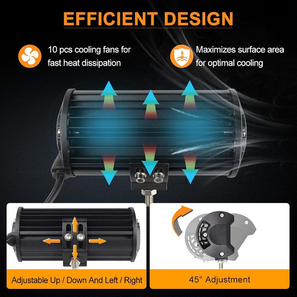 [عمر افتراضي يصل إلى 50,000 ساعة] - زعانف التبريد العشرة الموجودة في الجزء الخلفي من مصابيح القيادة LED لتبديد درجة الحرارة في الهواء المحيط. يعمل على زيادة دوران الهواء إلى أقصى حد ومساعدة مصابيح LED على التبريد بسرعة أثناء التشغيل، مما يزيد من عمرها الافتراضي بشكل فعال لأكثر من 50,000 ساعة.