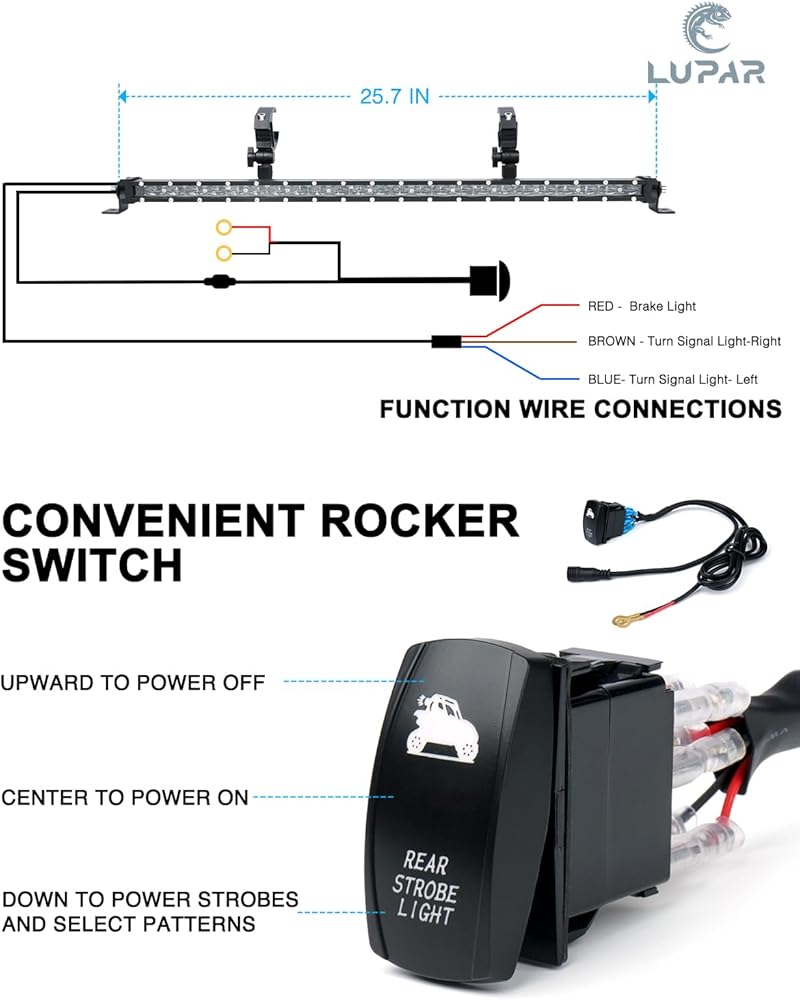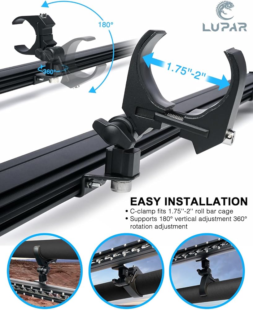 تركيب وتحكم بدون جهد لعشاق UTV - مصمم بدعامة تثبيت بمشبك على شكل حرف C، يناسب شريط أضواء المطاردة الخاص بنا بسهولة قضبان القفص الملفوفة مقاس 1.5-2 بوصة، مما يسمح بالتركيب السريع والخالي من المتاعب على UTV RZR الخاص بك. يضمن المفتاح المتأرجح التحكم المريح في وظائف شريط الإضاءة، مما يمنحك السيطرة الكاملة على تجربة الإضاءة على الطرق الوعرة.