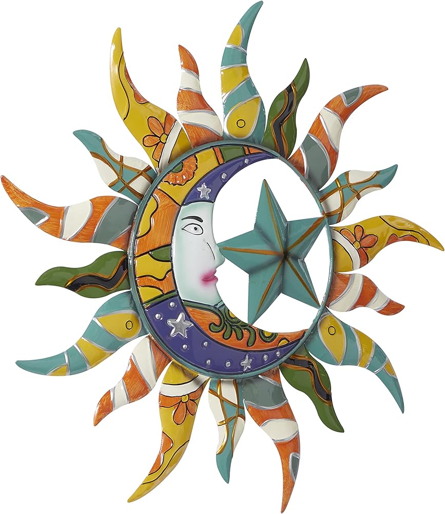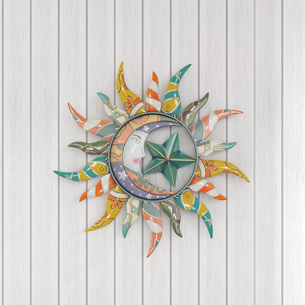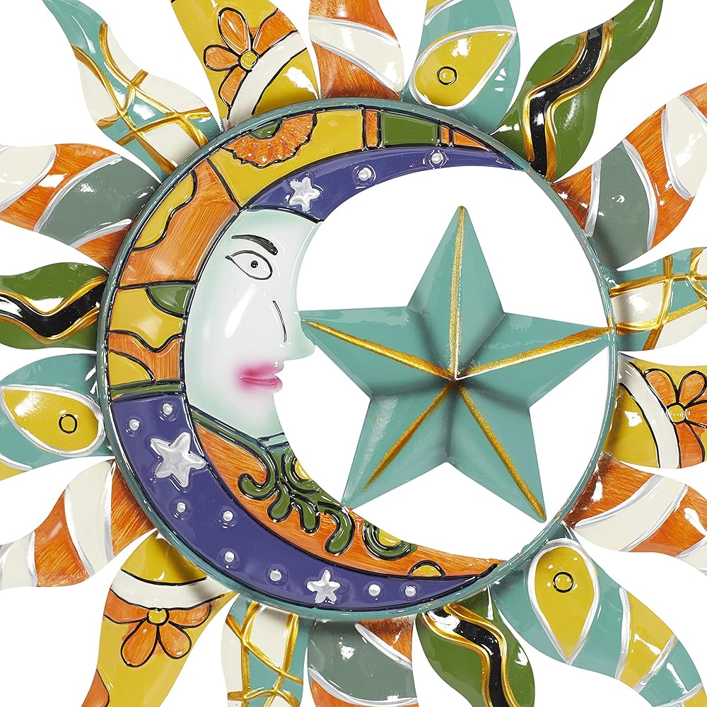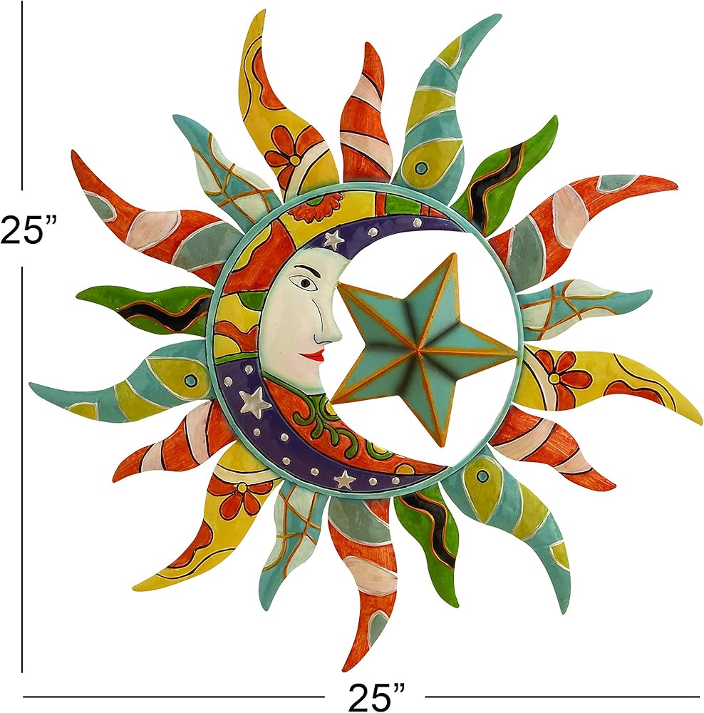 Create a balanced space in the most creative way with this expertly crafted wall decor for captivating focal point. Showcase your personality and turn your walls into an art gallery with this captivating wall decor. Create a boho inspired wall scenery with this colorful sun, moon, and star sculpture and transform your room into a playful nature art set. This item ships in 1 carton. Iron wall decor makes a great gift for any occasion. Can be hung vertically using the keyholes; nails and screws not included. Suitable for indoor use only. This item ships fully assembled in one piece. This is a single multi colored wall sculptures. Eclectic style.