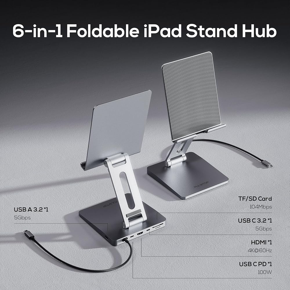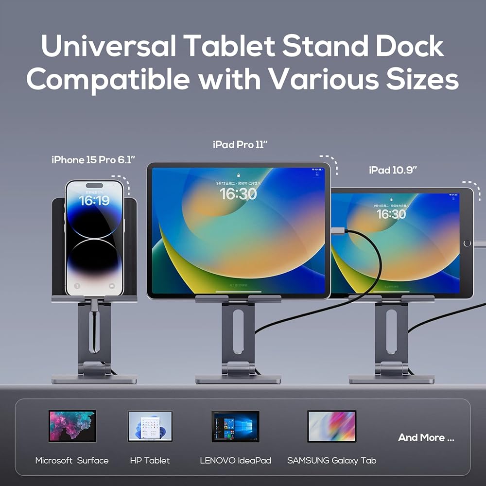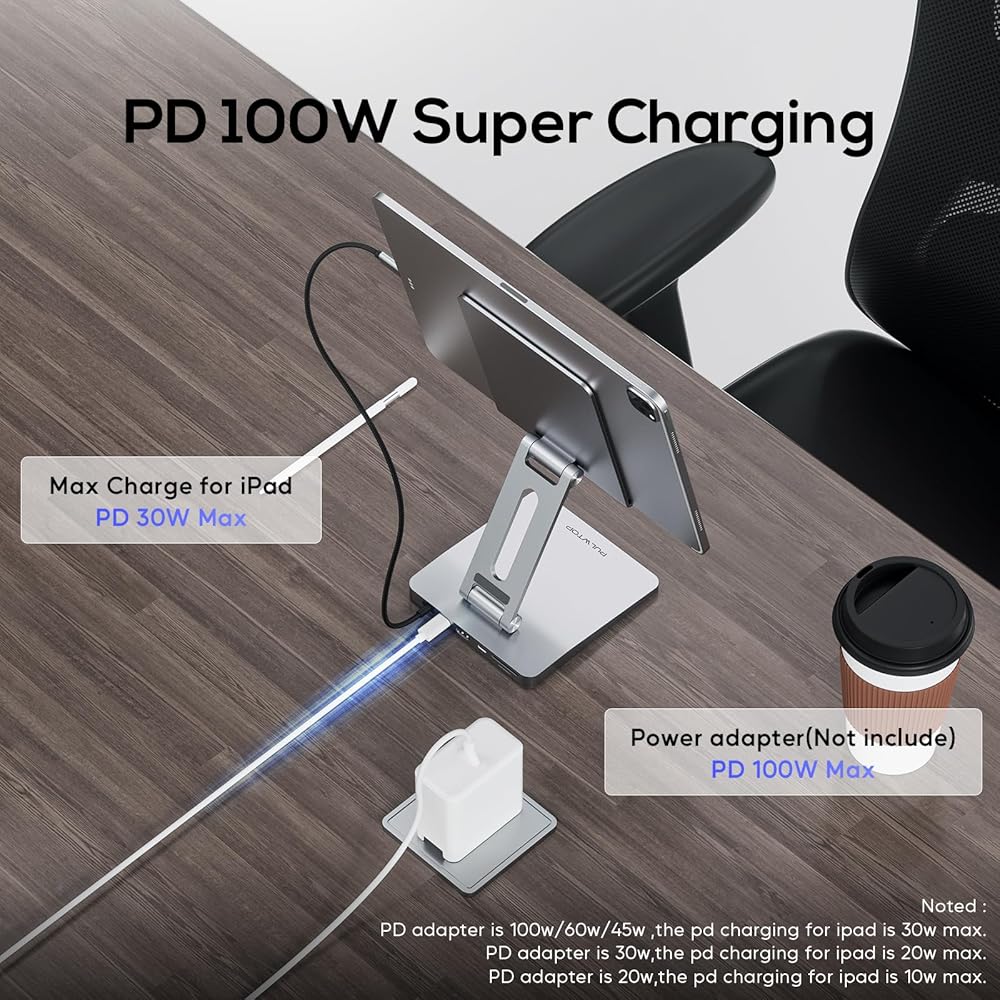 قاعدة آيباد مع حامل تابلت قابل للطي 4K HDMI، 100 وات PD، منافذ USB 3.0، SD/TF، لجهاز iPad Pro 2018/2020/2021/2022، iPad Air 2020 iPad Mini 6th، M1 M2، Windows، Android