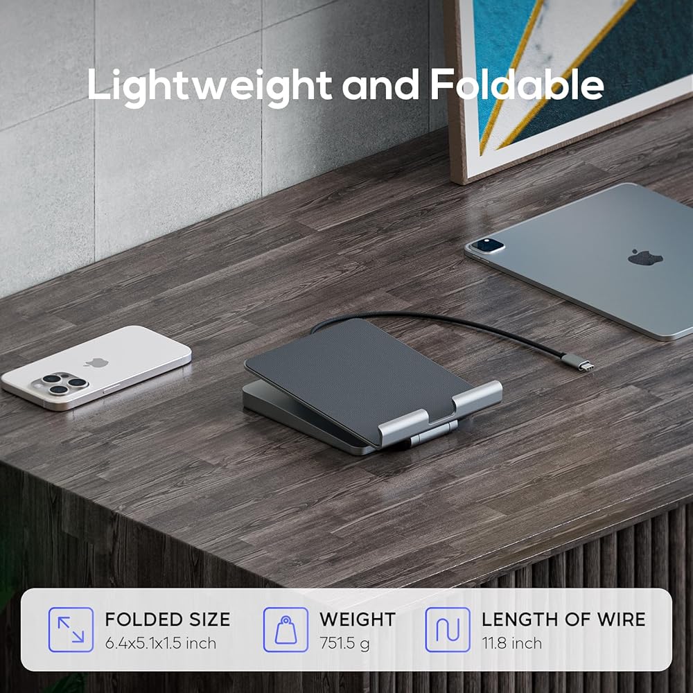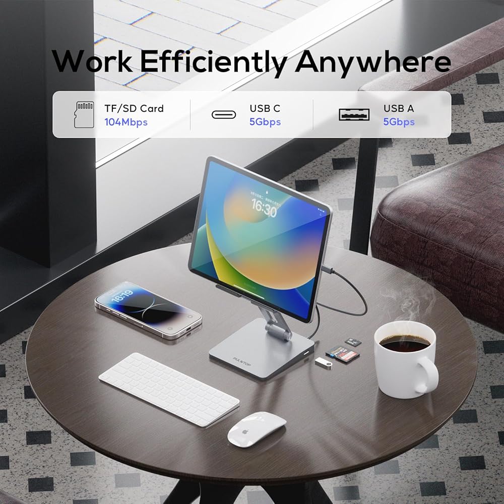 【تحويل طريقة عملك】قم بتحويل جهاز iPad Pro أو الكمبيوتر اللوحي USB-C إلى مركز إنتاجي قوي باستخدام محور USB-C. يأتي مزودًا بحامل قابل للطي للحصول على زاوية وارتفاع واتجاه مثاليين. بغض النظر عن مكان عملك، فإن هذا المحور يجعله أكثر ملاءمة.