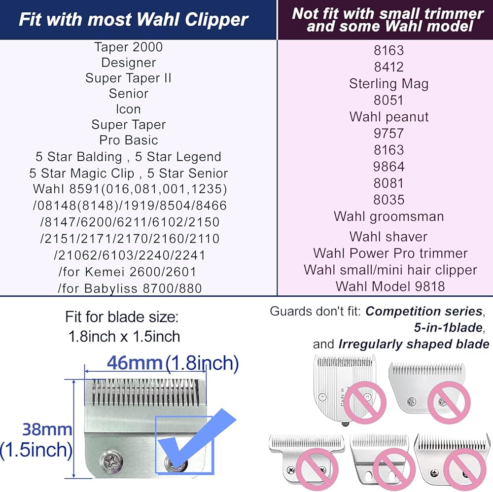 [مناسبة لقص الشعر Wahl]: مناسبة لقص الشعر بالحجم الكامل. لا تناسب ماكينة قص الشعر الصغيرة/الصغيرة من واهل. لا تناسب سلسلة واهل لتشذيب الفول السوداني بيبي ليس. يرجى الاطلاع على الصورة 6 للتعرف على نماذج محددة قابلة للتطبيق.