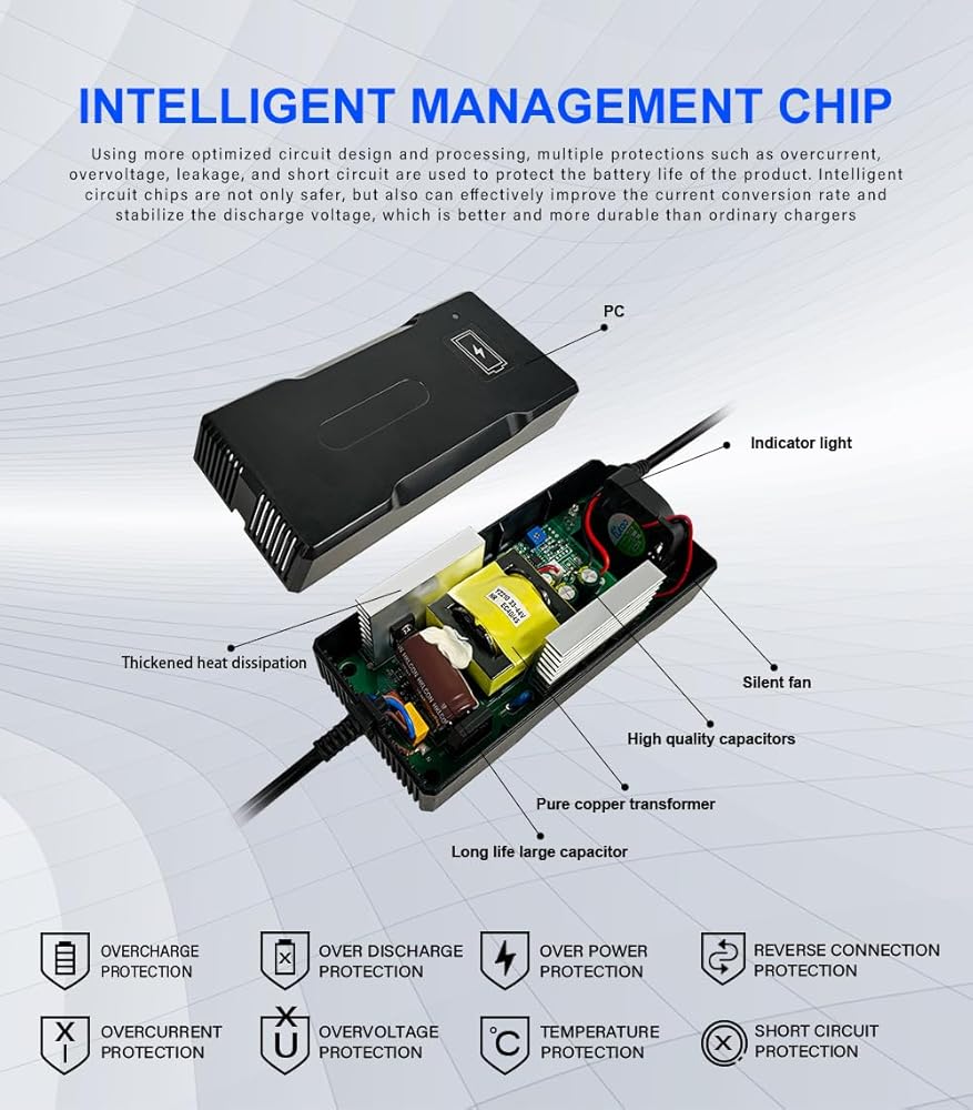 • مصممة بشكل جيد - تناسب فقط بطاريات حمض الرصاص 4s 48 فولت. مادة لوحة PCB الموجودة في الشاحن هي FR-4، وهي صغيرة الحجم وخفيفة الوزن وعالية الكفاءة وأقوى وأكثر استقرارًا