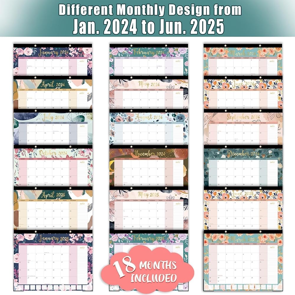 ✅تنظيم على مدار العام: يوفر تقويم المكتب 2024-2025 تغطية واسعة لمدة 18 شهرًا، من يناير 2024 إلى يونيو 2025، مما يضمن أنك متزامن دائمًا مع أحدث التواريخ. يقدم هذا التقويم الزهري ذو الألوان المائية نظرة عامة شهرية شاملة، مما يتيح لك التخطيط والتنفيذ ببصيرة.
